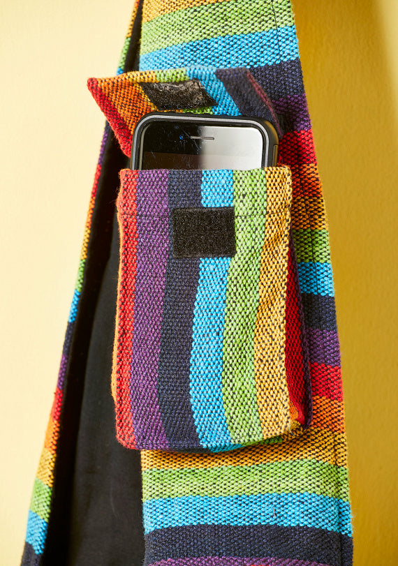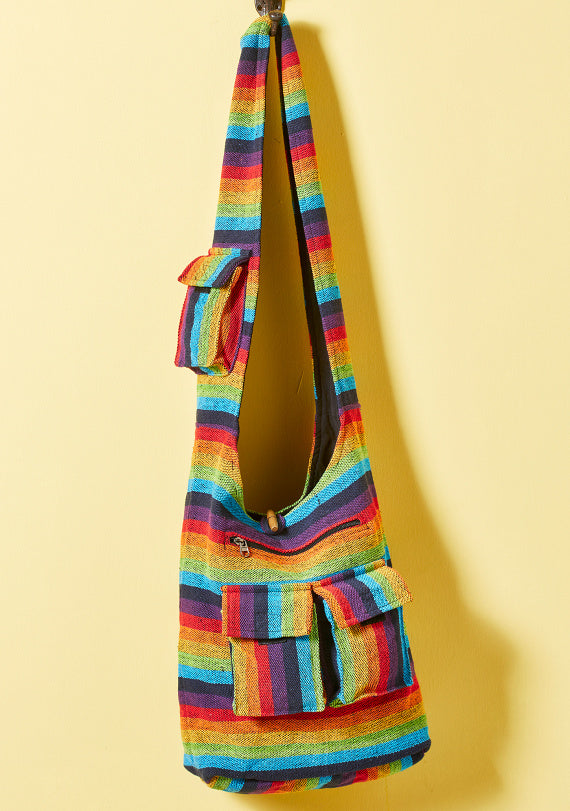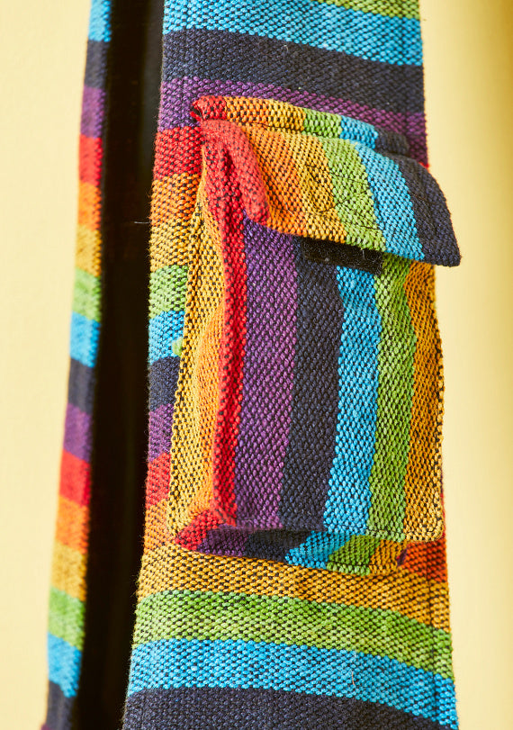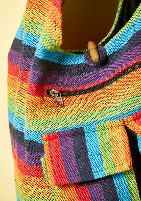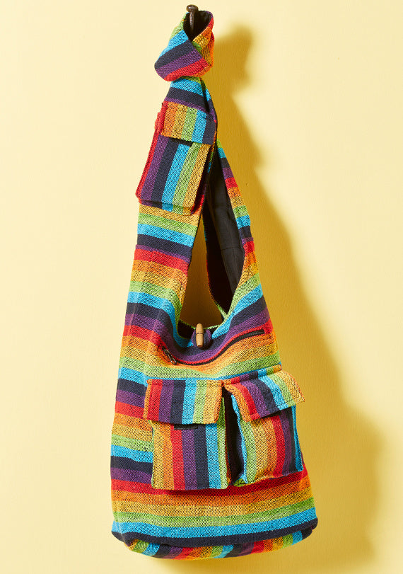 This lovely gheri cotton shoulder bag features a vibrant rainbow stripe design and an adjustable length strap for customizable wear on the shoulder or crossbody. The bag has a secure zip fastening, a convenient front pocket, and a washable, versatile design. It also includes an internal zip pocket for valuable items. Maximum strap length is 109cm (adjustable) and overall dimensions are 33x34x11cm.