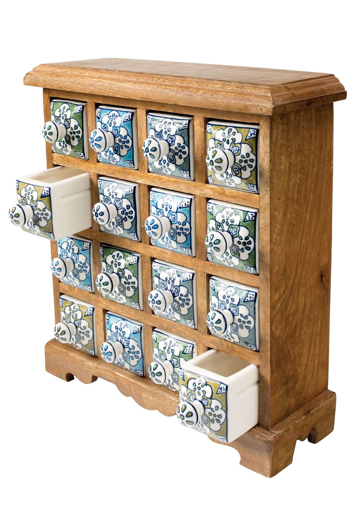 Hand Painted Ceramic 16 Drawer Chest, Mango Wood