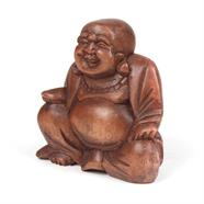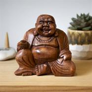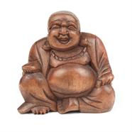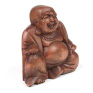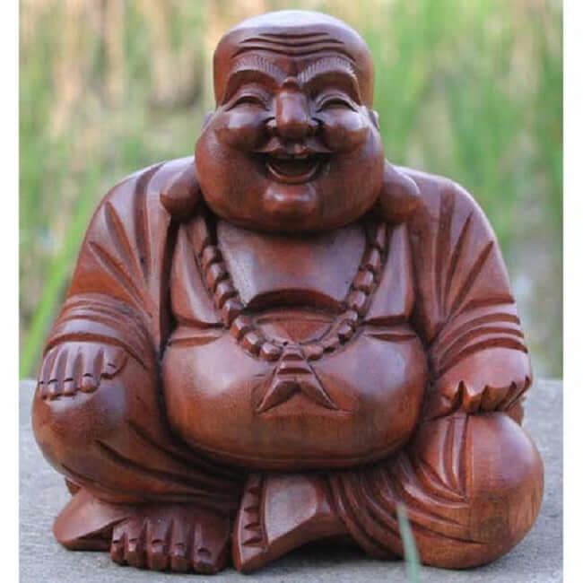 The laughing Buddha, also known as Budai, is a handcarved figure that represents contentment and abundance in Chinese culture. Traditionally depicted as an obese, bald man wearing a robe and carrying prayer beads, he serves as a reminder that wealth is not necessary for happiness. Rubbing his protruding belly is believed to bring wealth, good luck, and prosperity to the bearer.