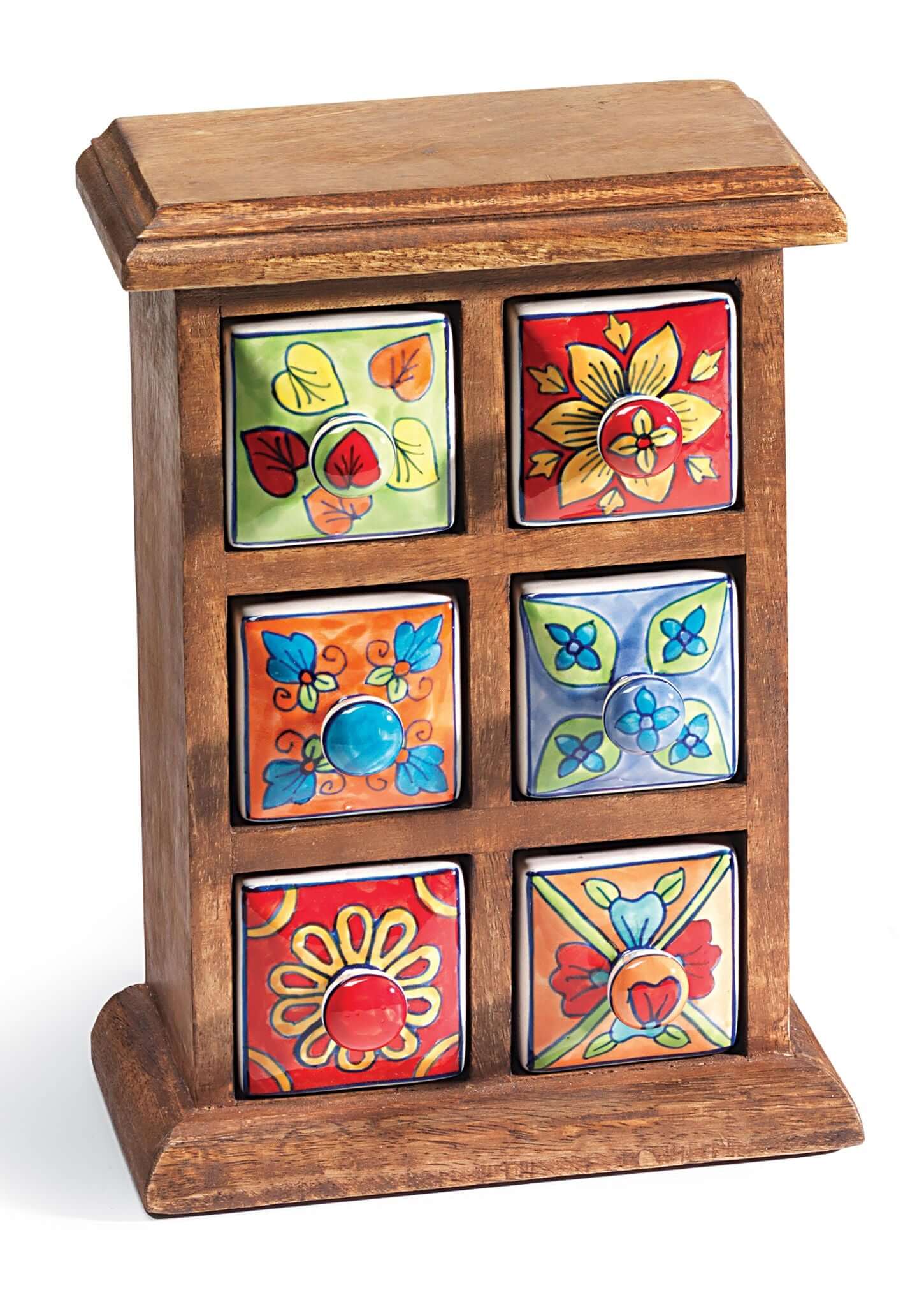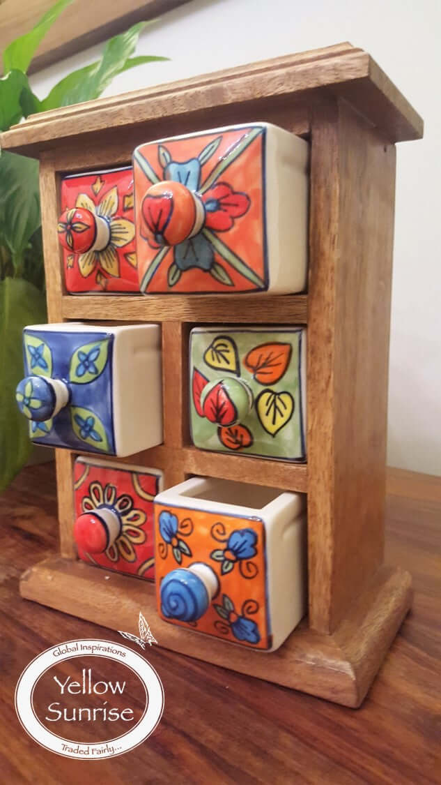 Made from sustainable mango wood and hand painted with fantastic detail and brilliant colours, this 6 drawer ceramic storage chest is a truly unique piece.