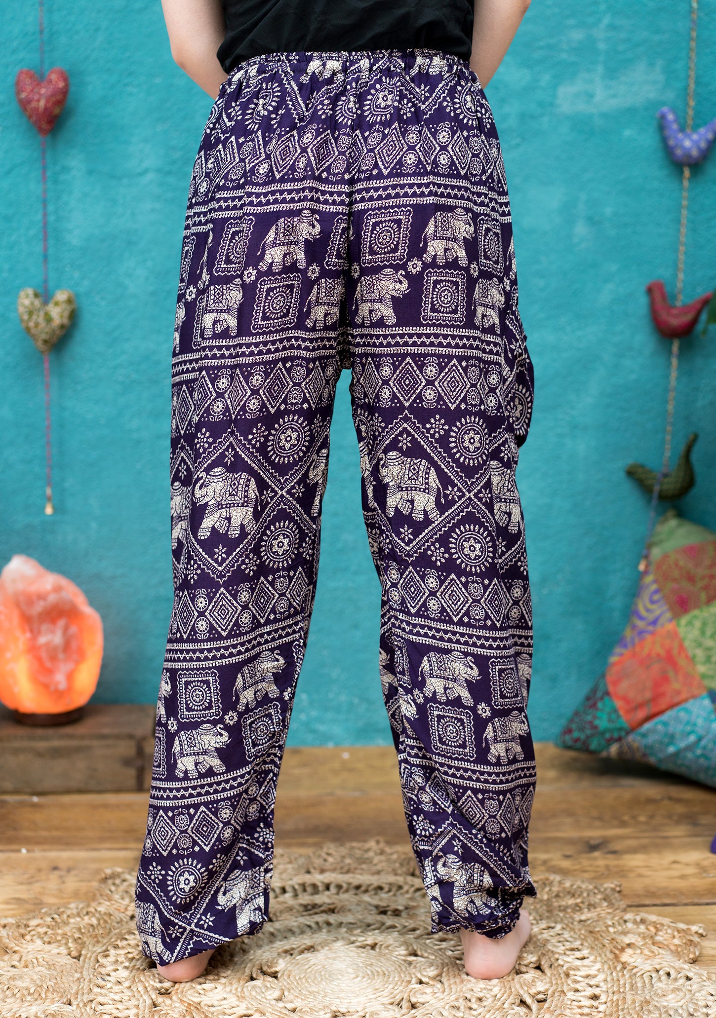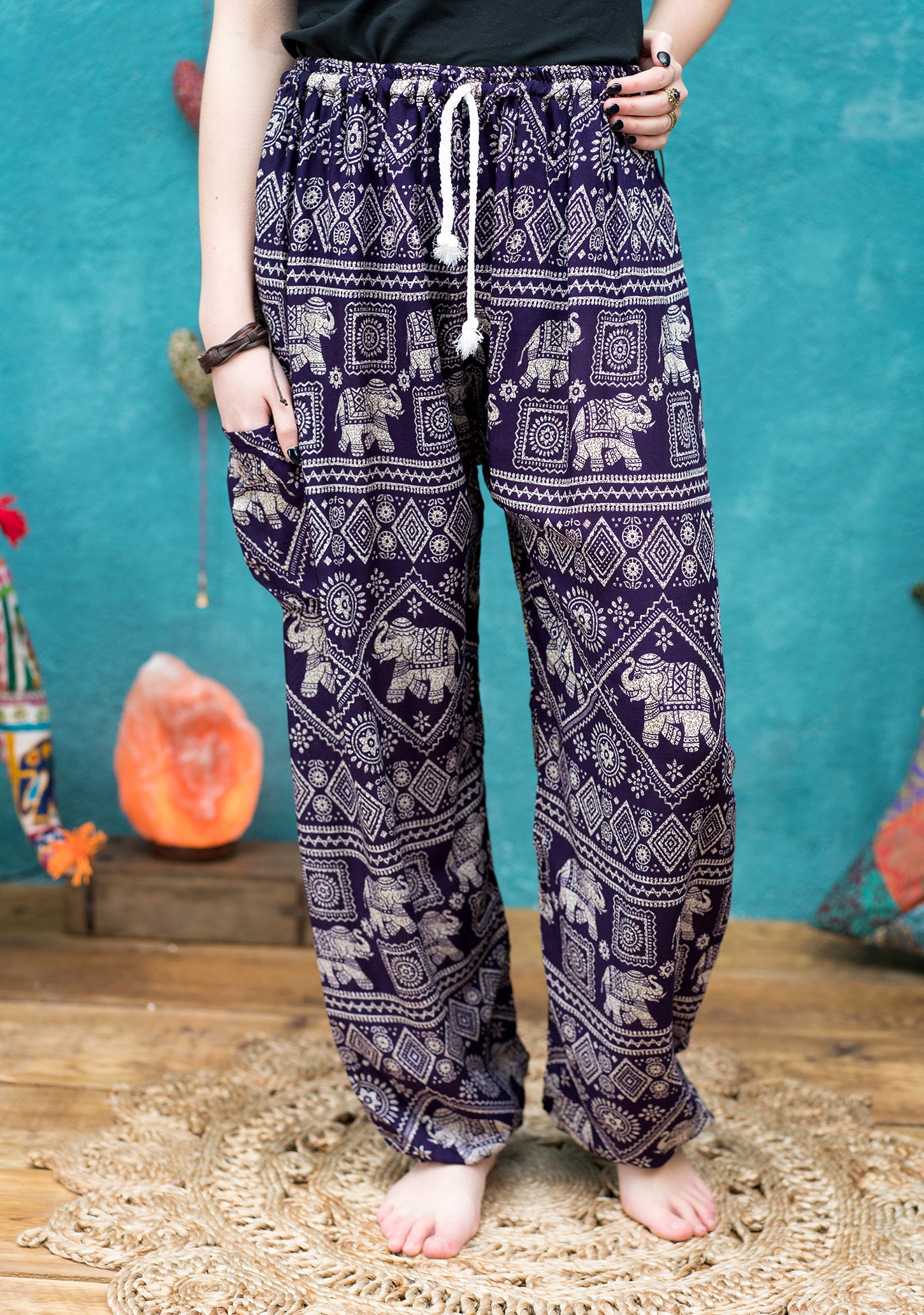 These harem trousers, featuring a stylish elephant print, are made from lightweight fabric and designed in a freesize (UK size 12-14 maximum). The elasticated waist with a white plaited pull cord and gathered ankles ensures maximum comfort and flexibility. Complete with a side patch pocket, these pants are ideal for various activities such as festivals, leisure, beach holidays, and even yoga or pilates. Made from 100% Rayon, they are not only versatile but also quick-drying for your convenience.