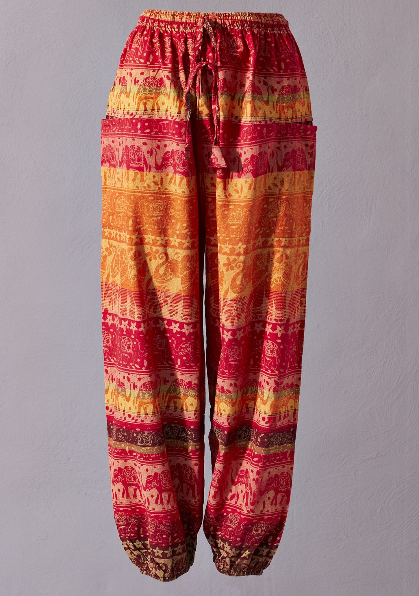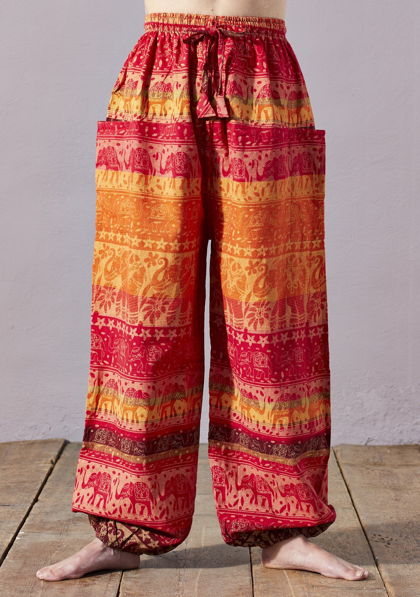 These harem trousers showcase a striking terracotta elephant print, drawing inspiration from classic oversized genie pants. The expandable waistband, matched with a coordinating fabric tie and ample ankle gathering, provides a blend of cultural ease and unhindered mobility.