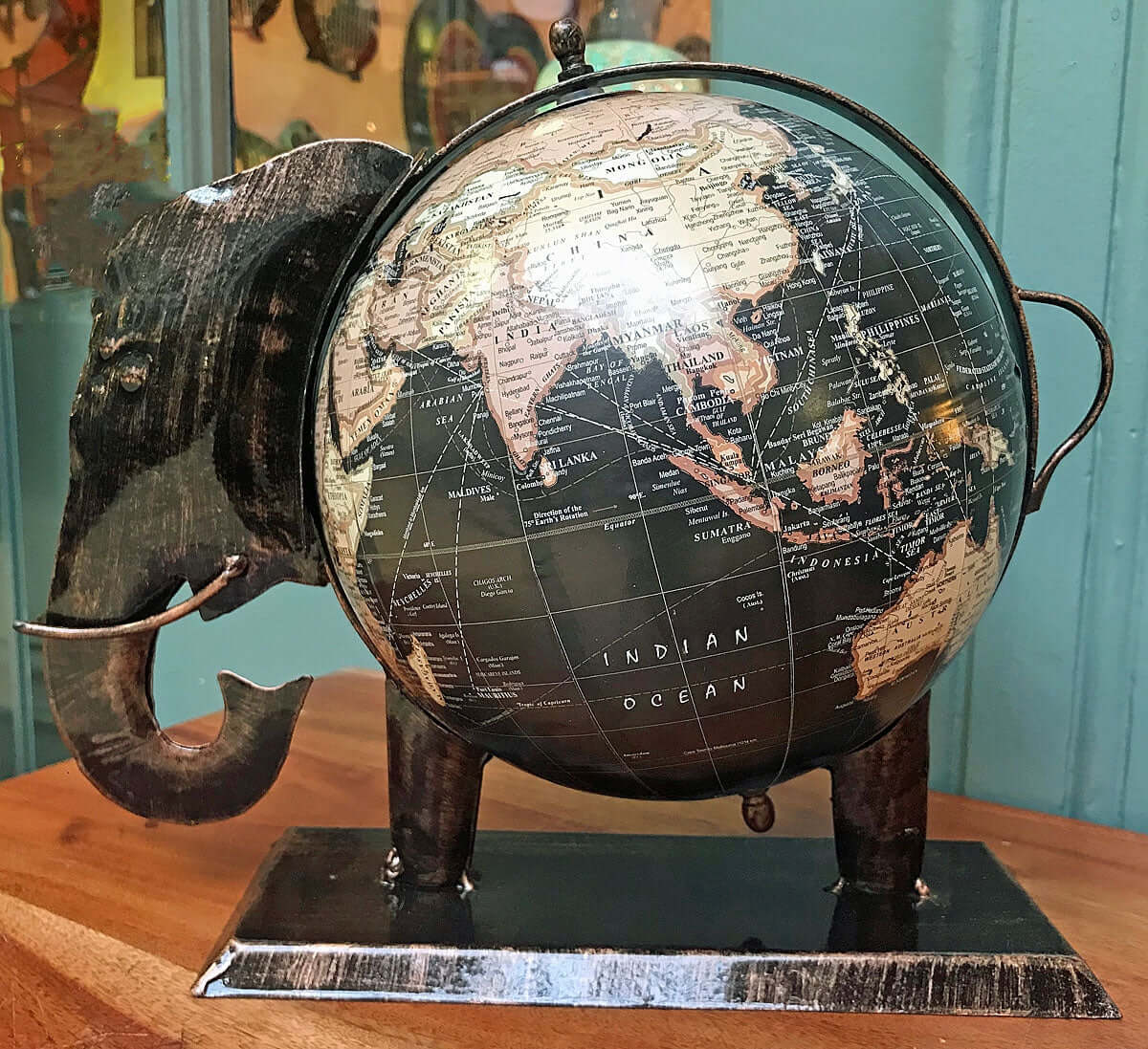 Handmade by pasting individual leaves of paper around a ball to create the globe. It is mounted and turns. This globe is unusual, eclectic and a truly novelty gift.
