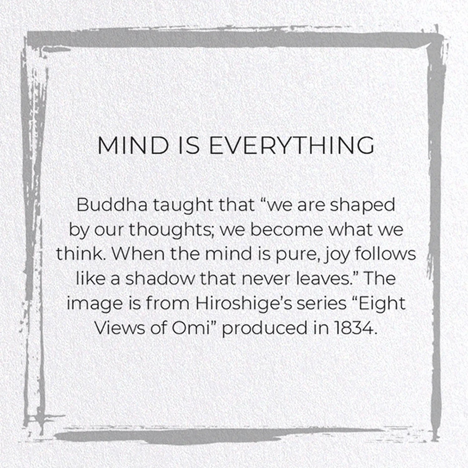 Buddha taught that “we are shaped by our thoughts; we become what we think. When the mind is pure, joy follows like a shadow that never leaves.” The image is from Hiroshige’s series “Eight Views of Omi” produced in 1834.