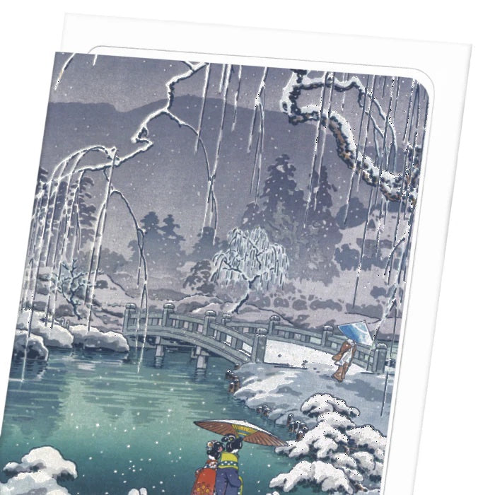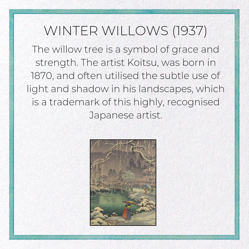 The willow tree is a symbol of grace and strength. The artist Koitsu, was born in 1870, and often utilised the subtle use of light and shadow in his landscapes, which is a trademark of this highly, recognised Japanese artist.
