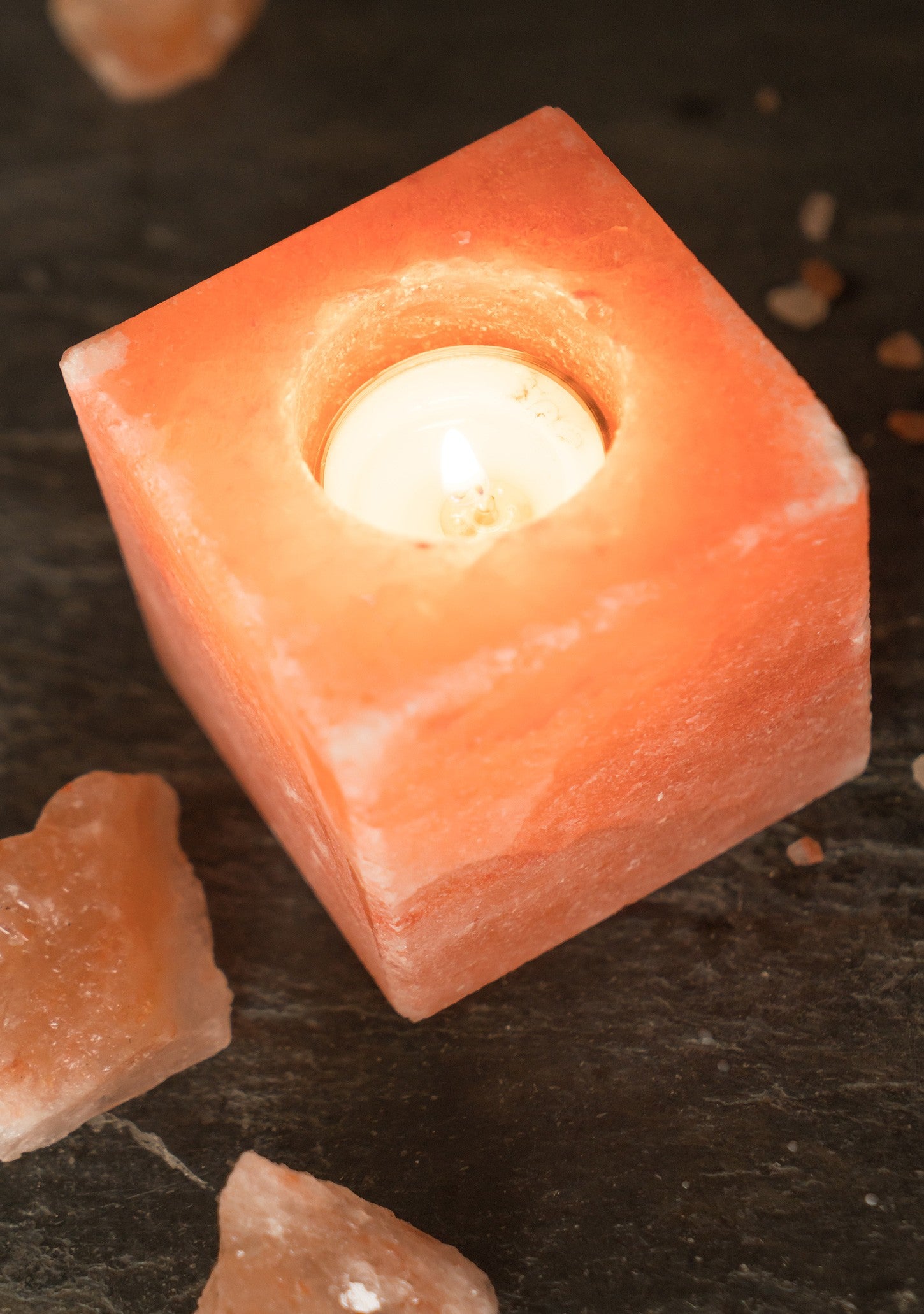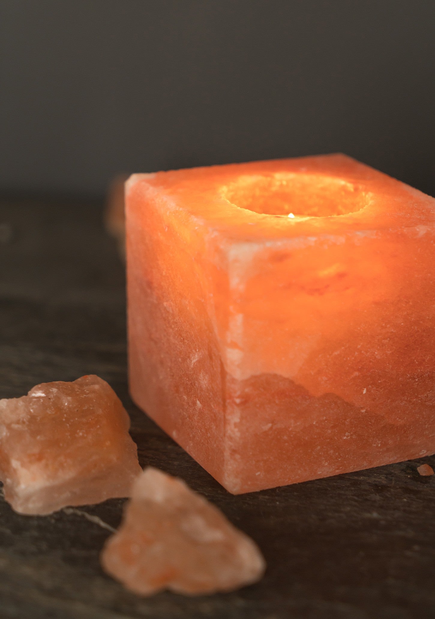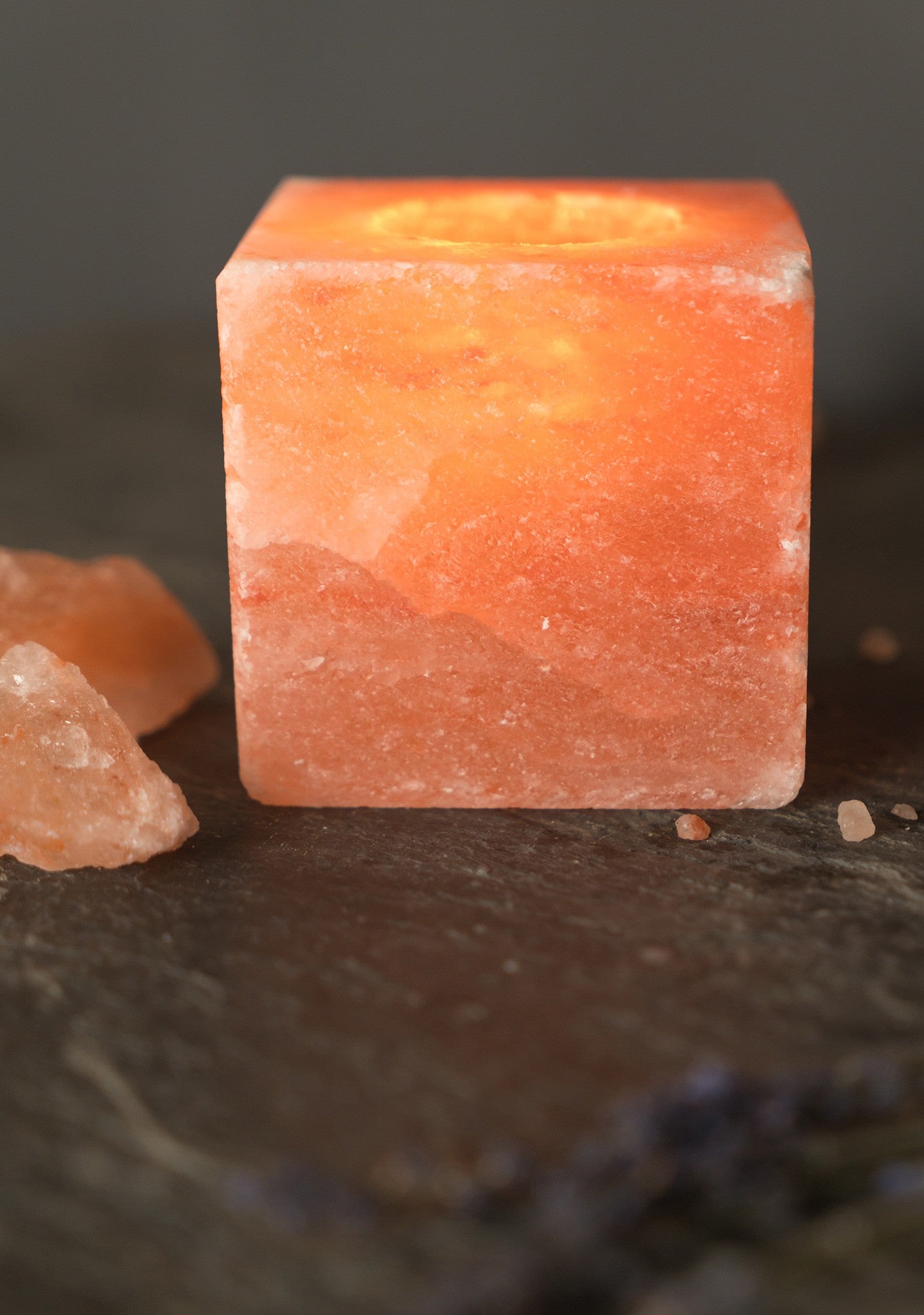 Promote positivity with a square-shaped natural Himalayan salt tealight holder. Full of organic texture, light the cube for a welcoming table centrepiece and a warm atmosphere. Every candle holder is unique and naturally beautiful.