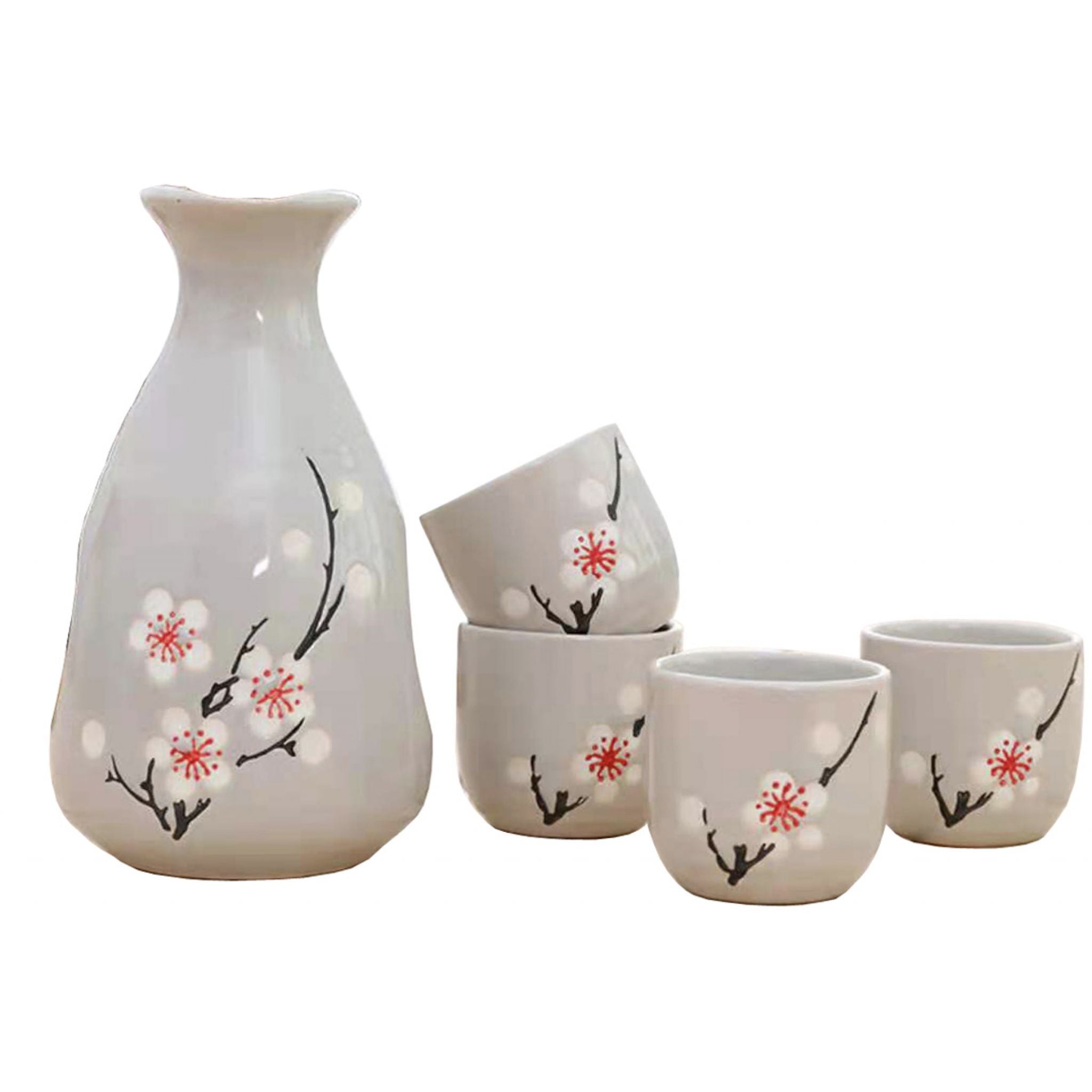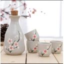 Sake Bottle and cup set in pale grey with blossom sprig decoration.