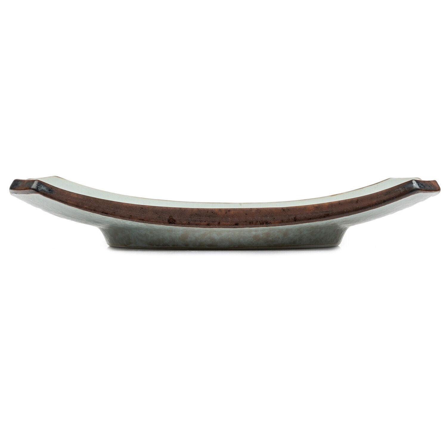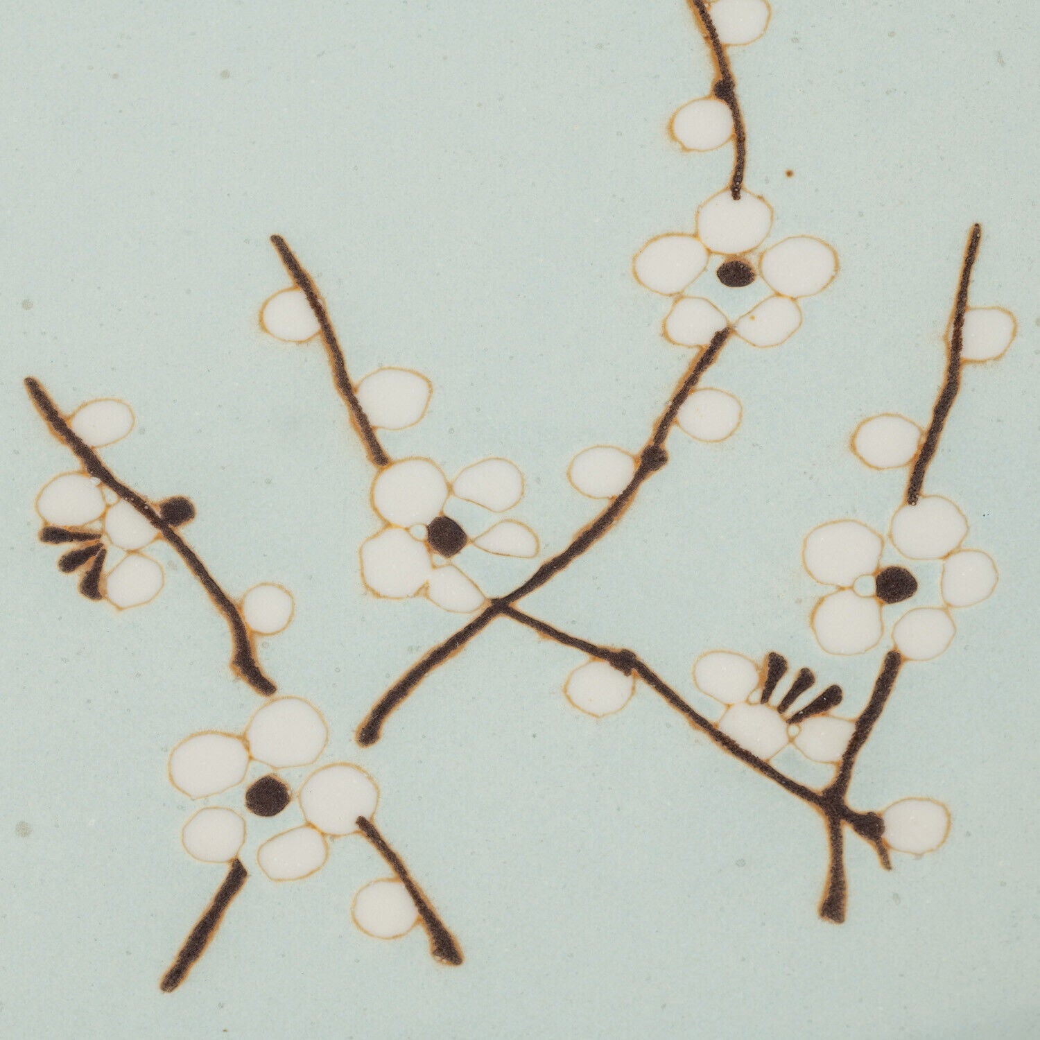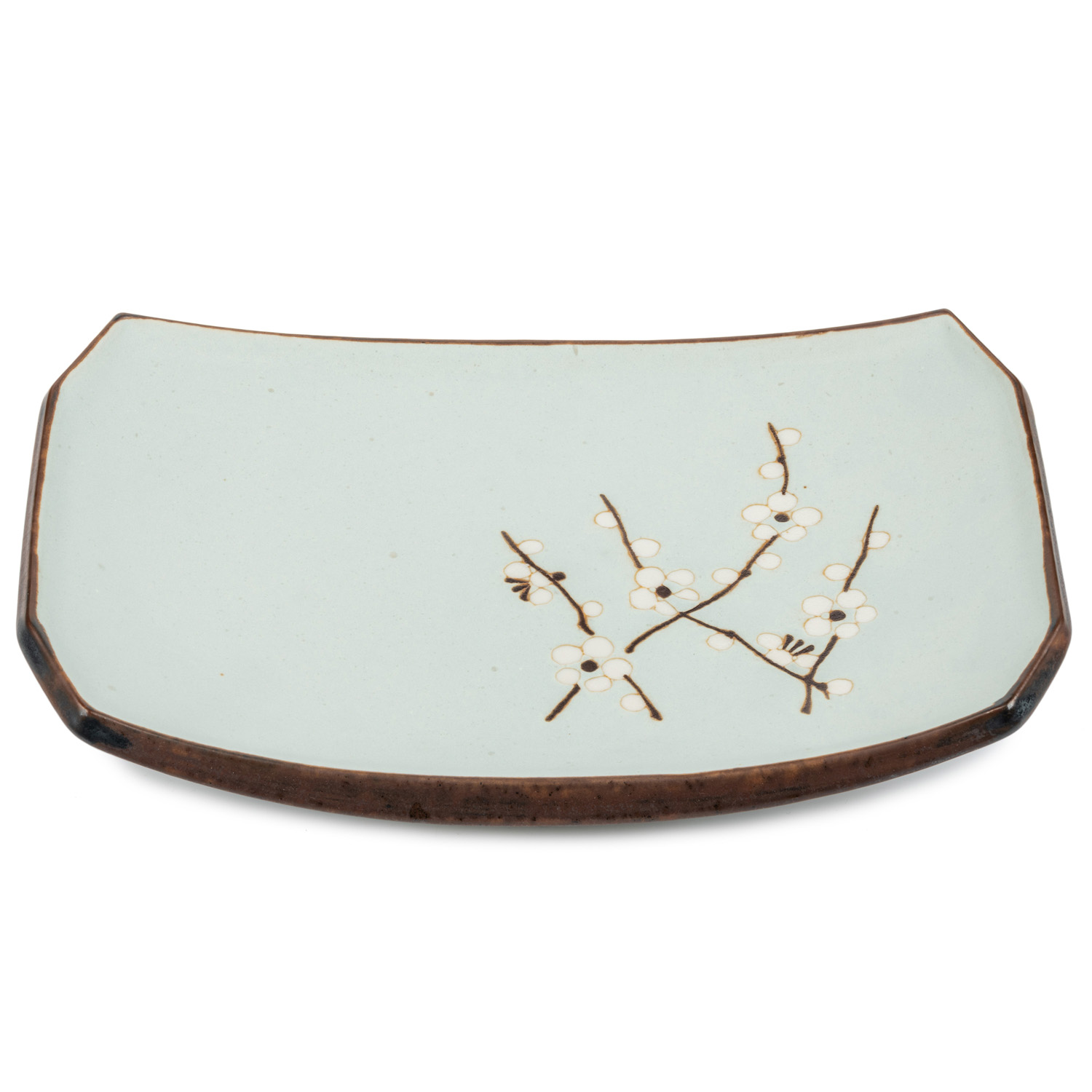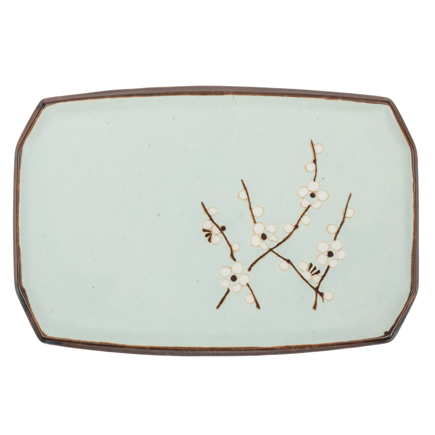 Exceptional quality, the Soushun Cherry Blossom Japanese Sushi Plate showcases Japanese minimalist design at its very best! This gorgeous ceramic sushi plate has a lovely soft and creamy duck-egg greeny-blue glaze and a simple brown and white cherry blossom design which really makes you want to touch it!