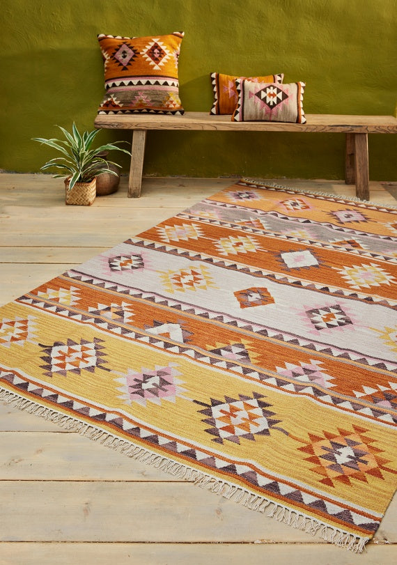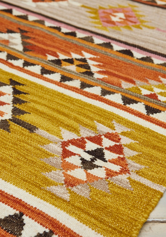 The Kunduz rug showcases a vibrant, geometric design in warm earthy hues, delicately offset by a subtle touch of pastel. Handcrafted using traditional techniques, this flatweave kilim rug utilizes only natural materials and boasts eco-friendly production practices. Its rich colors and durable construction provide both insulation and long-lasting charm, adding a distinct and inviting warmth to any living space. Use as a focal point in your decor and enhance the look with coordinating kilim cushion covers on your furniture.