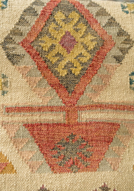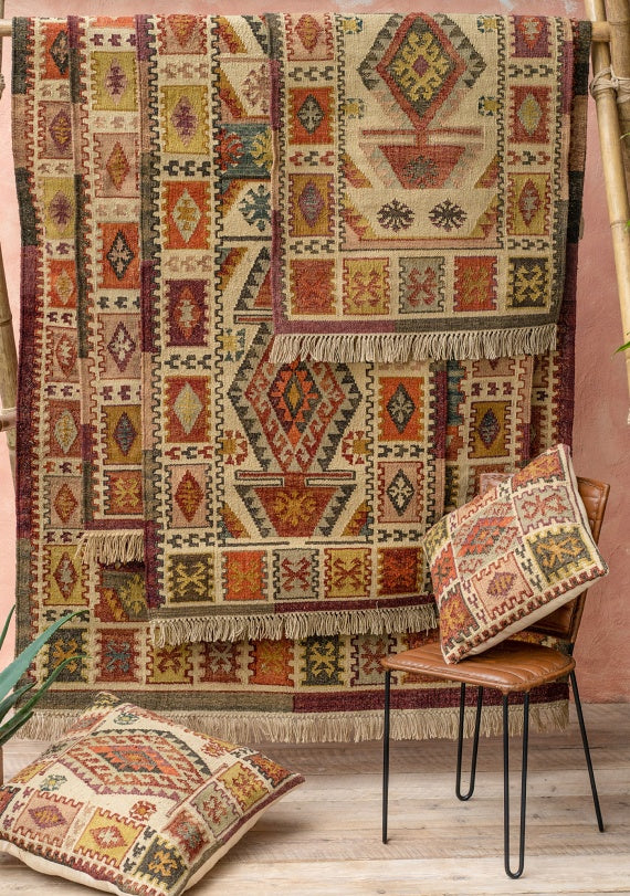Enhance your hallway or corridor with this striking, unique large runner rug. Featuring framed central diamonds and warm toned fringing at both ends, this traditionally hand-loomed rug boasts a texture that rivals wool kilims. It is durable, soft, and UV, stain resistant, making it ideal for outdoor or indoor use. Perfect for sunlit spaces, conservatories, and homes with active pets. Complete the look with matching Narayan cushion covers.
