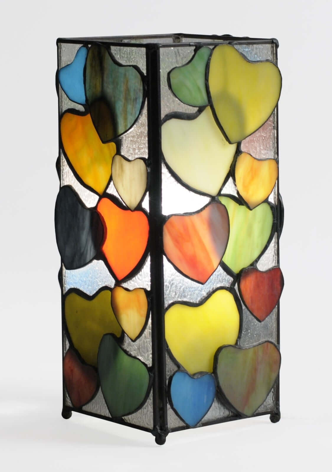- This Tiffany Style Lamp features a Hearts Design and is handcrafted using Favrile stained or iridescent glass. Each shade is meticulously assembled from individual pieces, creating a unique jigsaw-like pattern that is soldered together. It is the perfect addition to your home or a thoughtful gift for any special occasion.