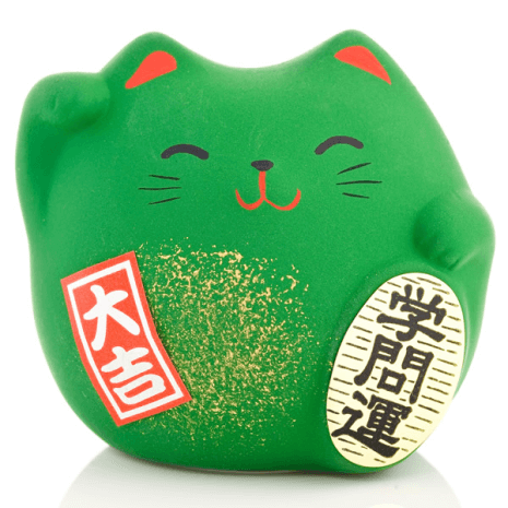 This lovely Feng Shui Study Lucky Cat is a very cute green ceramic Japanese lucky cat, or maneki neko, with its right paw raised which is believed will bring you good luck and success with your studies! The white Japanese kanji characters on the red box on the left mean good luck! We recommend you place your Small Feng Shui Study Lucky Cat near the entrance to your home, an ideal Japanese gift for students!