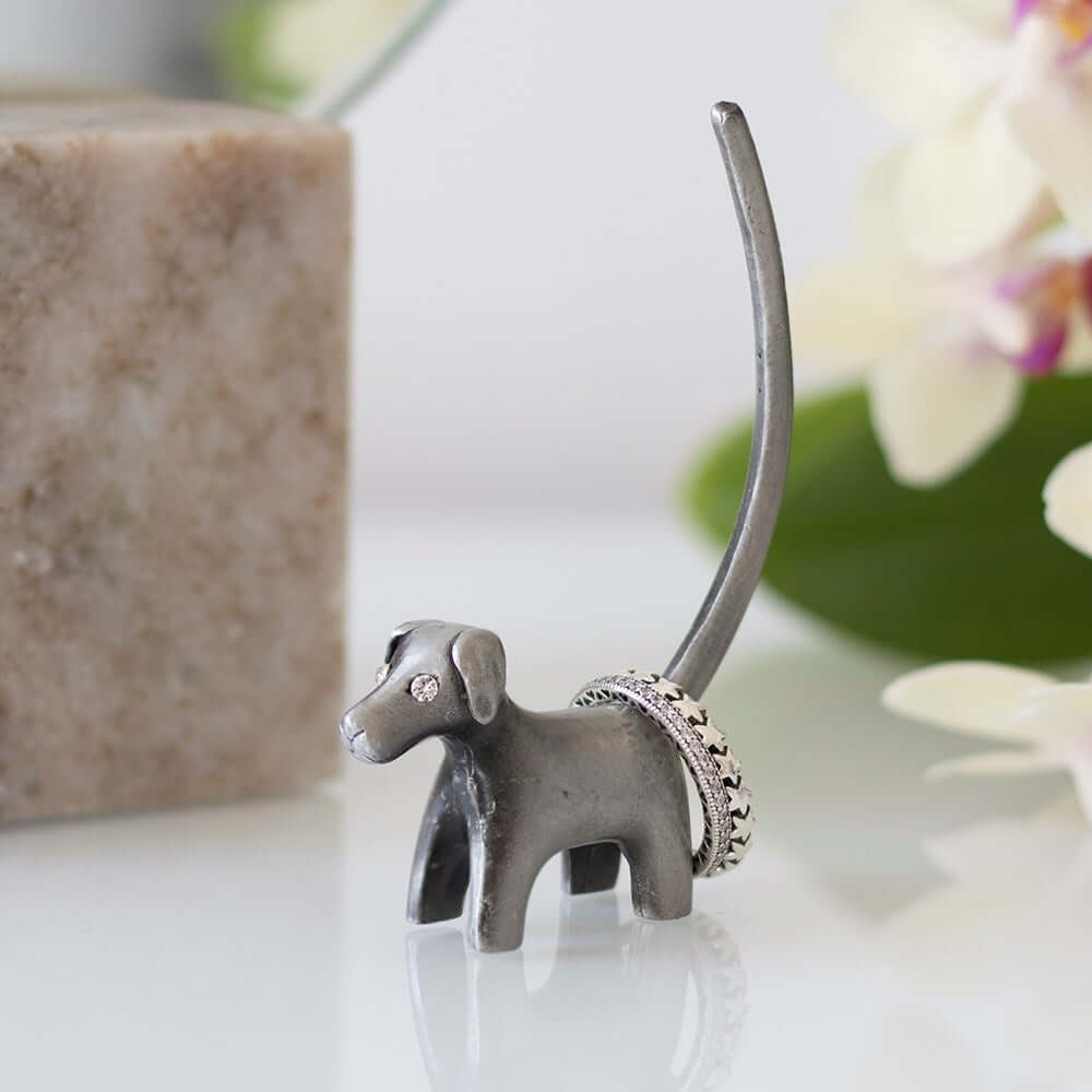 Keep rings tidy with this sweet ring holder shaped like a dog. Made of iron and makes an adorable decoration piece on a vanity or dressing table. Perfect gift for dog lovers.