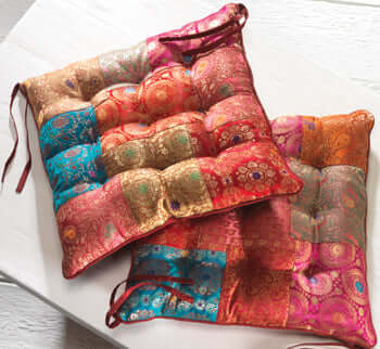 Brilliant colours and rich fabrics combine to produce this wonderful brocade patchwork chair pad with truly individual appeal.