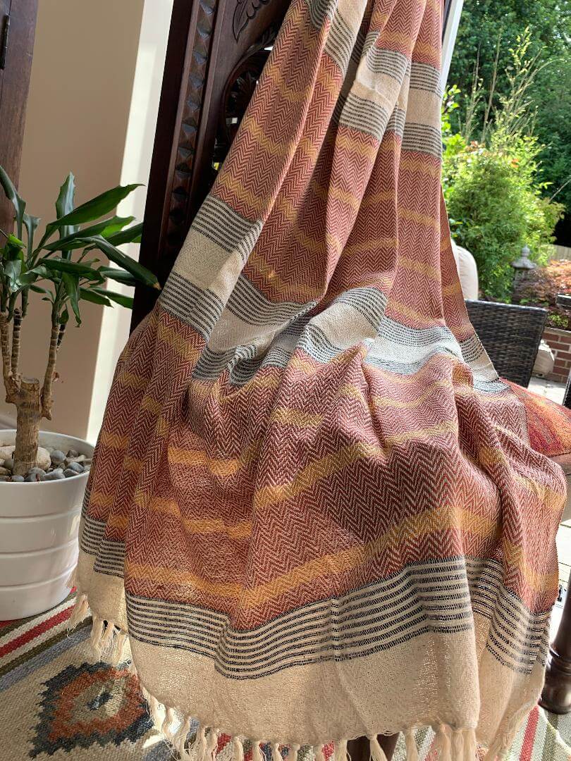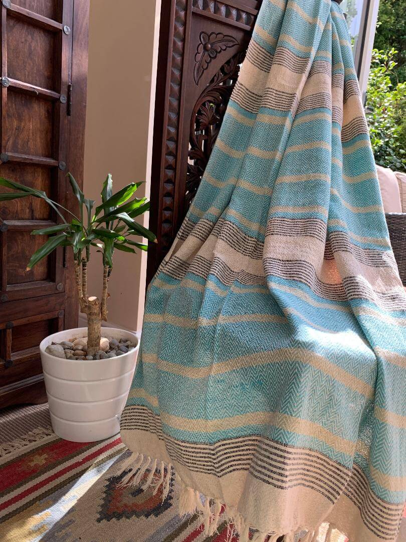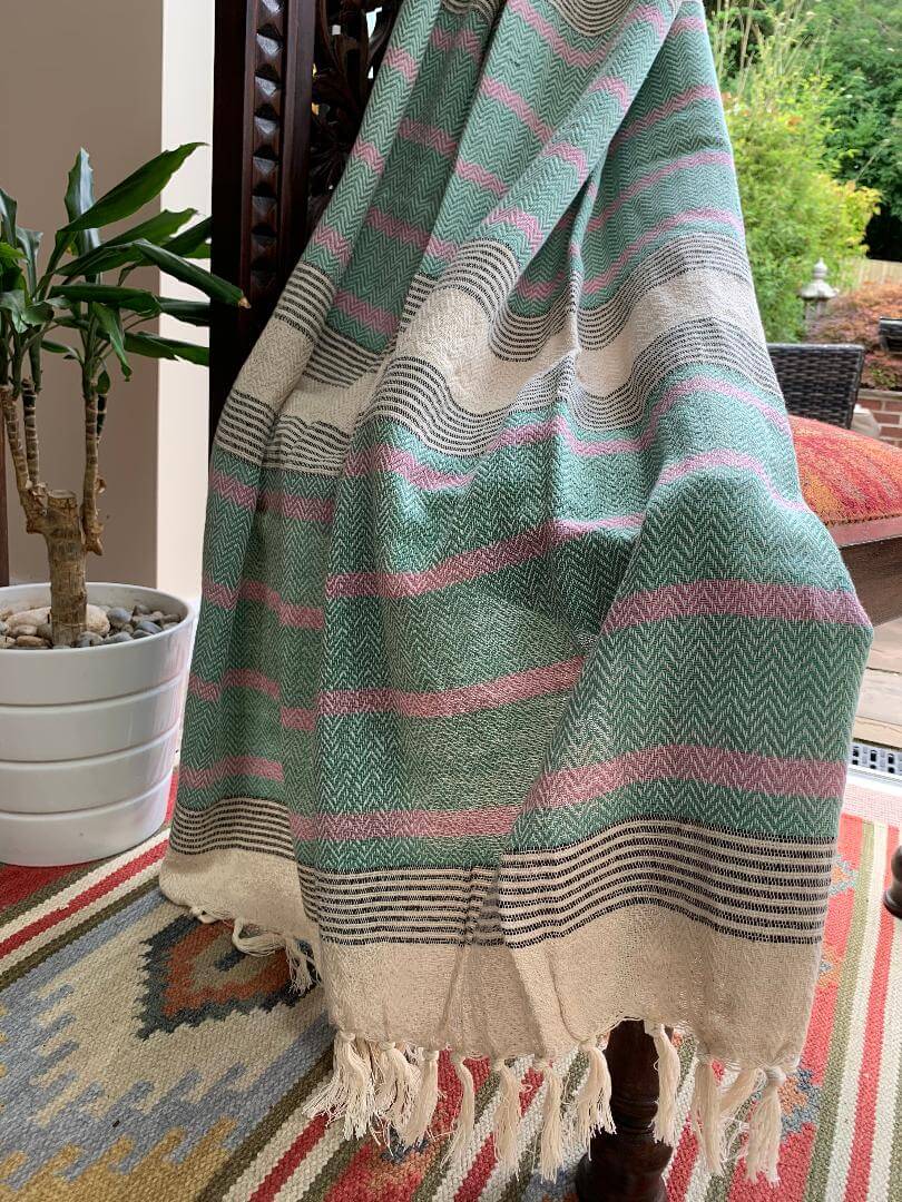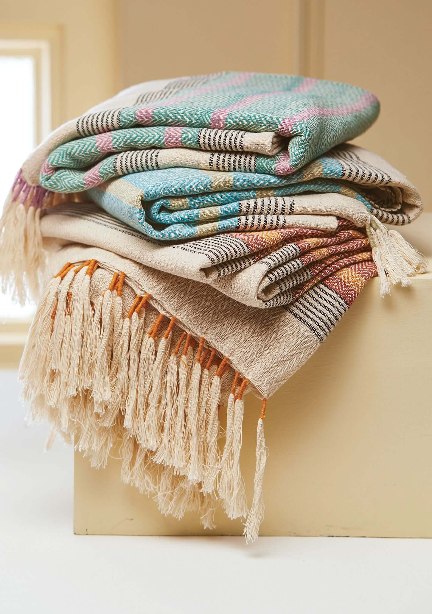 A hand crafted cotton throw, with tassel edge detailing and woven finish in peppermint and lilac, turquoise and lime or terracotta and caramel stripes. The subtle herringbone weave is a classic styling feature.