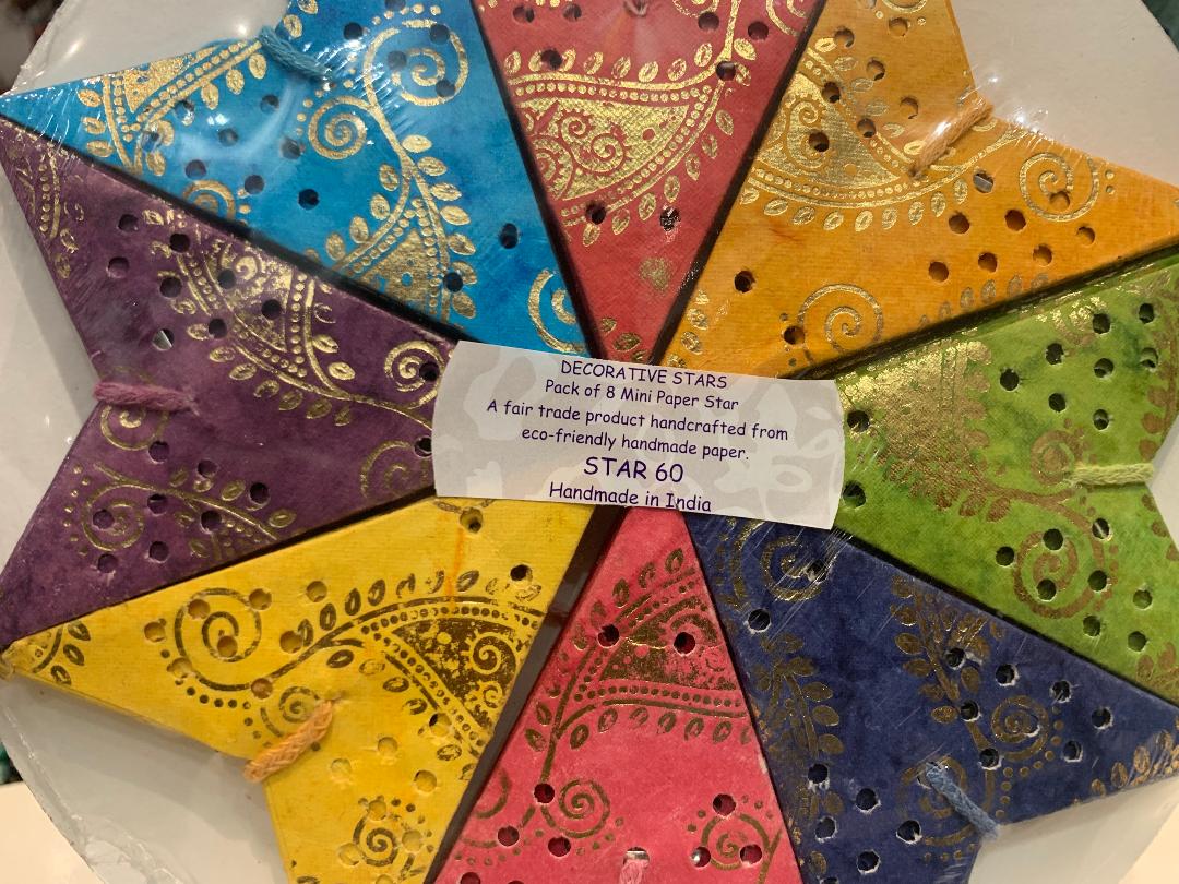 These 8 hand-crafted paper star decorations are shaped like a star and feature gold flower batik designs. Perfect for parties and seasonal events, simply unfold them and suspend them from a string of LED lights (available at major retailers) for creative room decor. They can be used in a variety of ways, such as decorating a wall, framing a window, or hanging over a vanity mirror or bed head. You can also fold them away and reuse them for special occasions. Made in India from 100% recycled cotton waste, using an environmentally-friendly process. Measures 18cm.