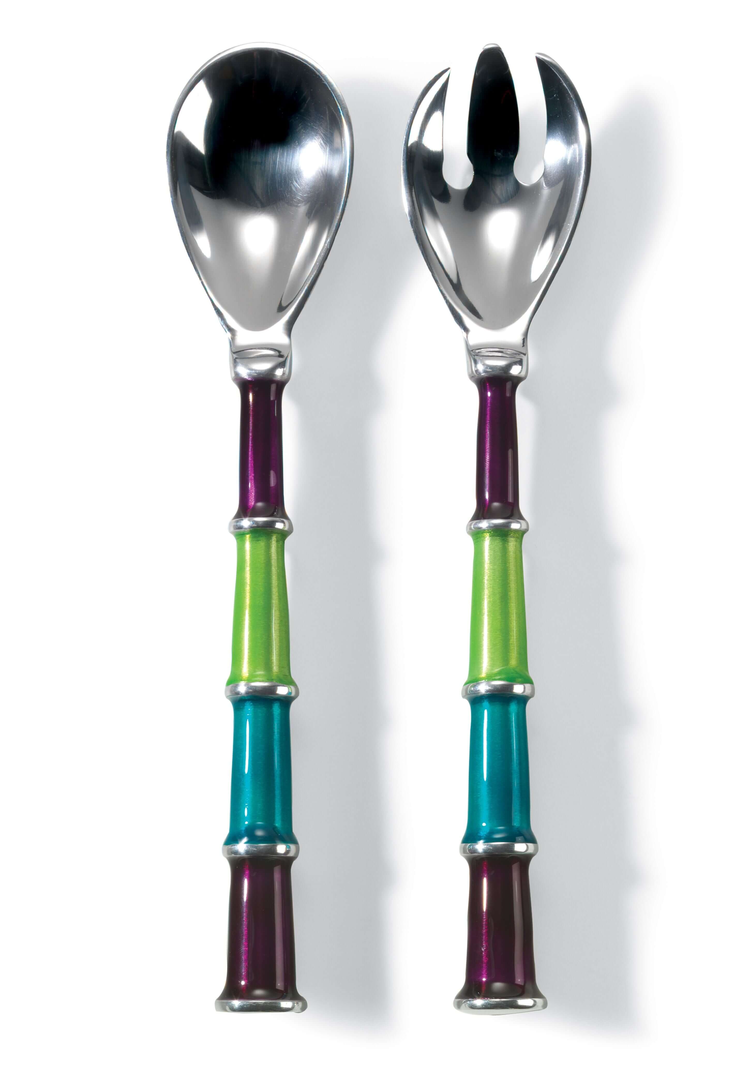 This pair of recycled aluminium salad servers in beautiful shades of lime, purple and teal will add contemporary glamour to your table.