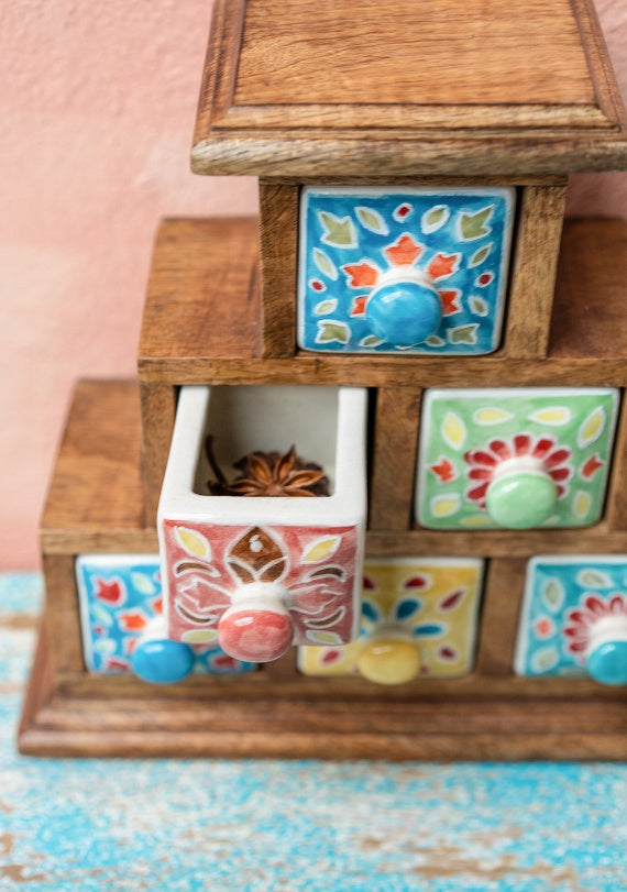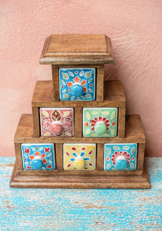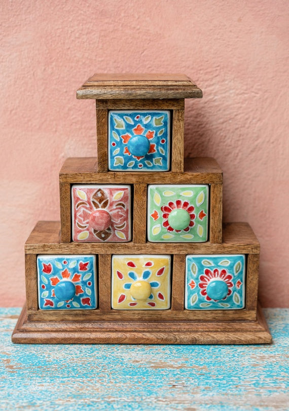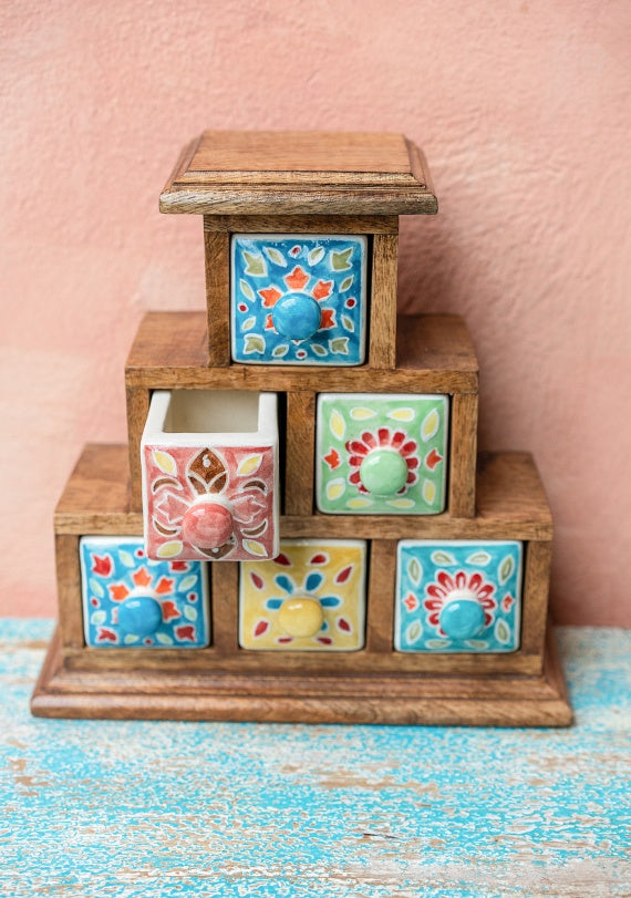 Each drawer set is handcrafted from sustainable mango wood and the ceramic drawers they contain are hand-painted with different but complementary designs. They are full of character and charm and make a very happy addition to any shelf, dressing table or desk.