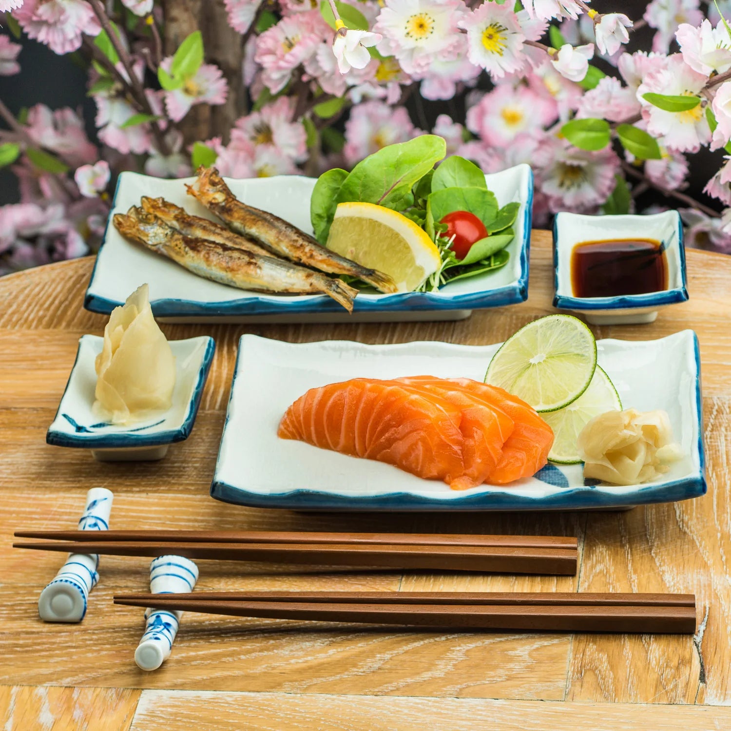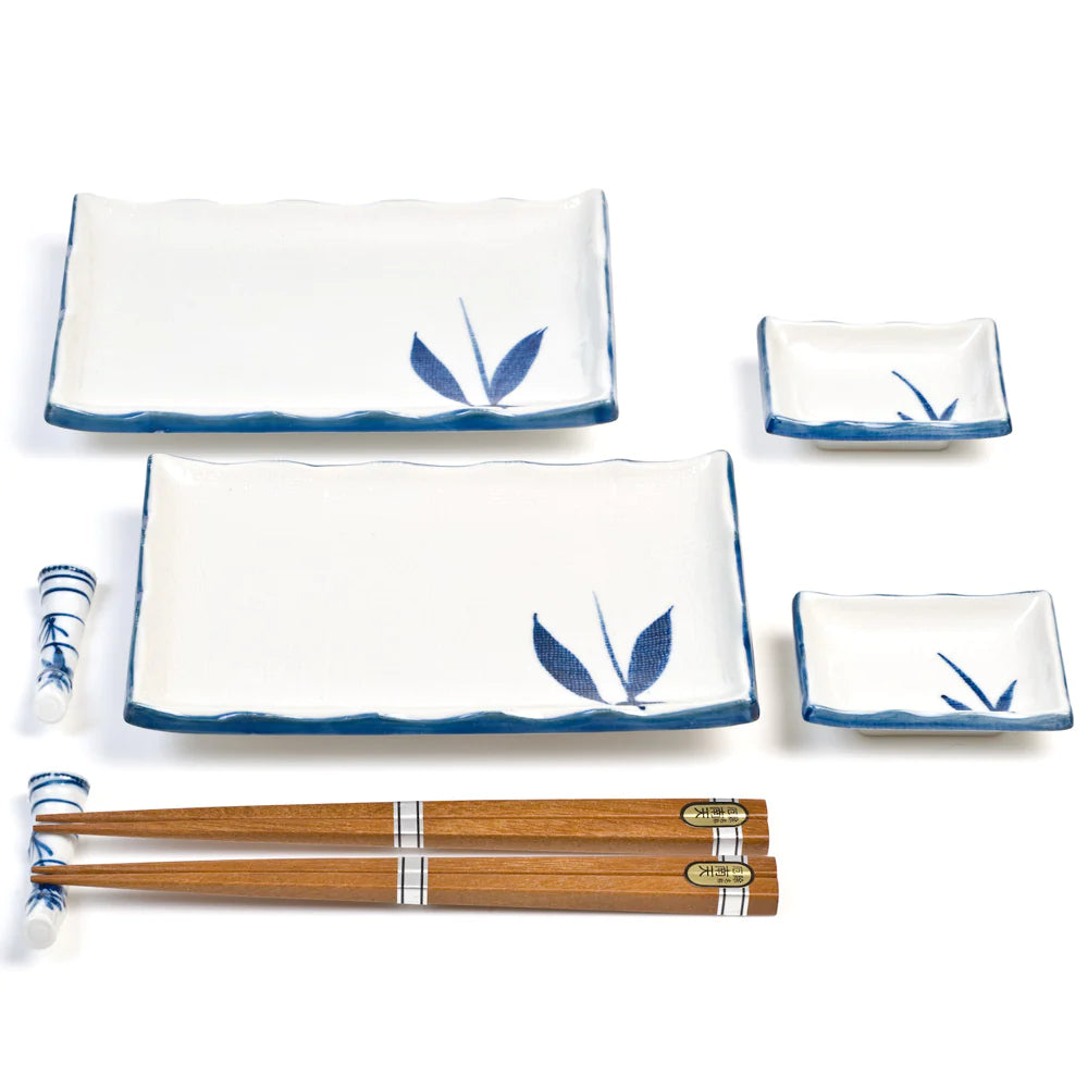 Indulge in a feast for the senses with our Bamboo Sushi Plate Set. The two ceramic plates in creamy white are adorned with a chic indigo blue bamboo design, while two matching dishes, chopsticks and elegant chopstick stands complete the luxury dining experience. Perfect for elevating any meal to a fine dining status.