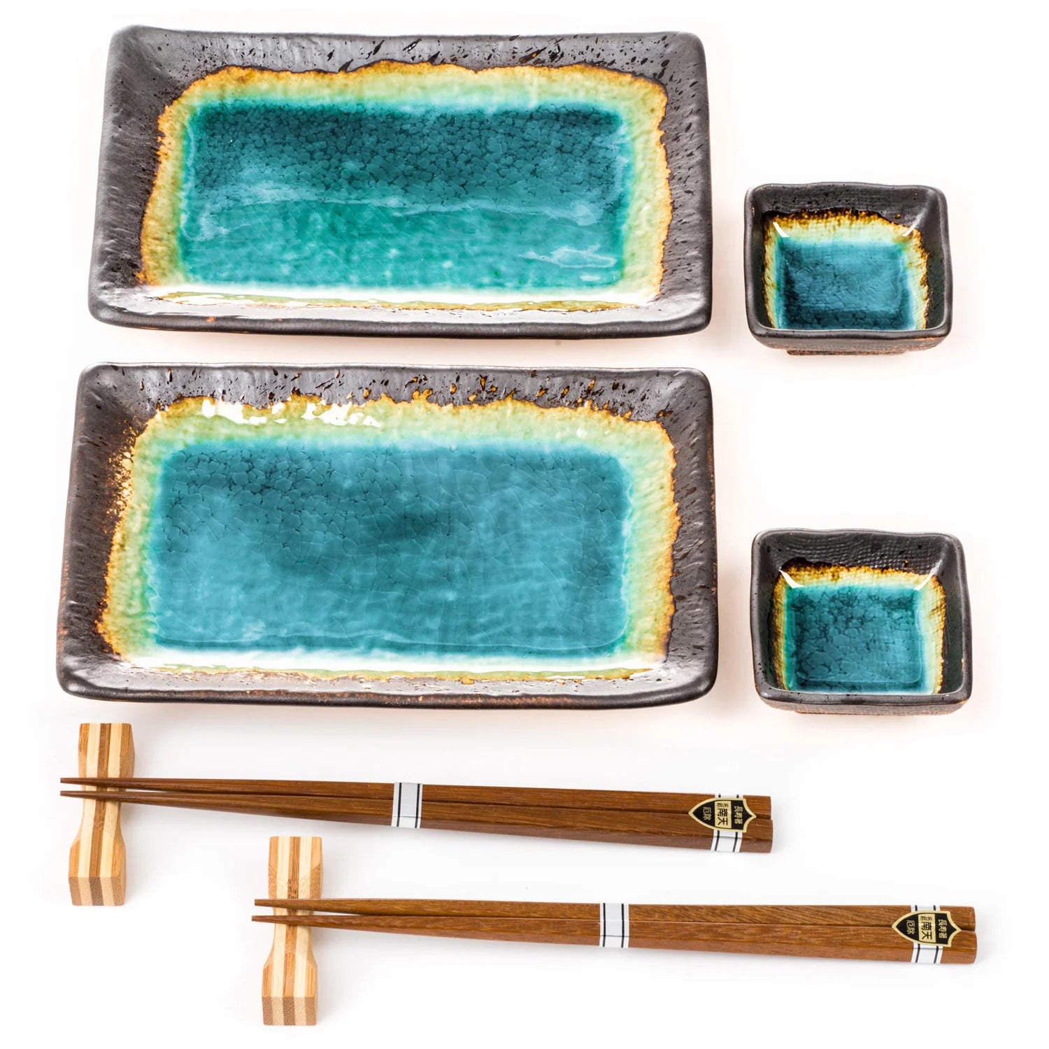 This beautiful Turquoise Crackleglazed Sushi Plate Set presents a unique style, pairing two Japanese-style sushi plates, two sauce dishes, two wooden chopsticks, and two chopstick rests. Its distinctive turquoise crackleglaze gives it a traditional look, perfect for a delightful sushi meal.