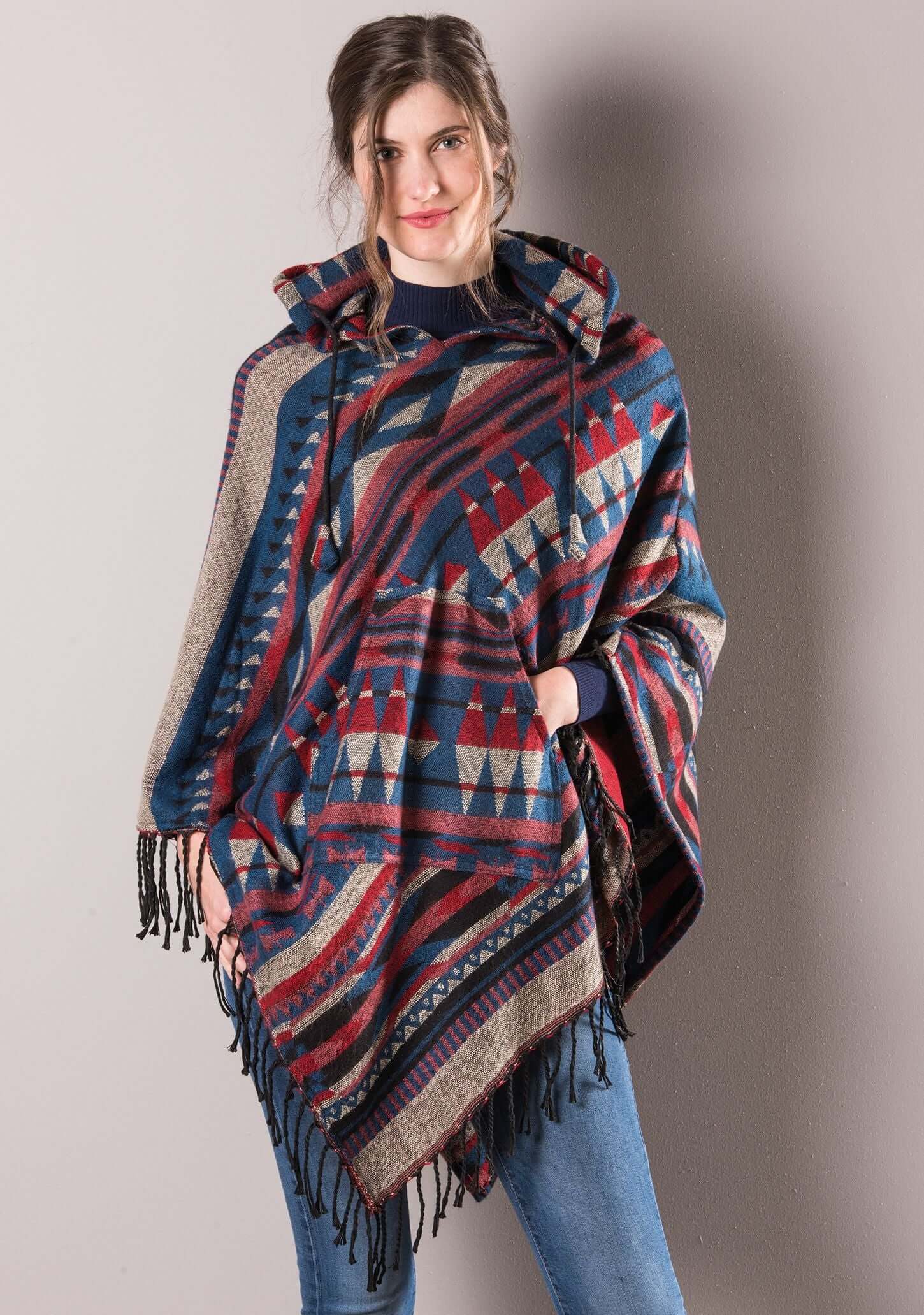 Brushed Acrylic Hooded Poncho with Pocket blue