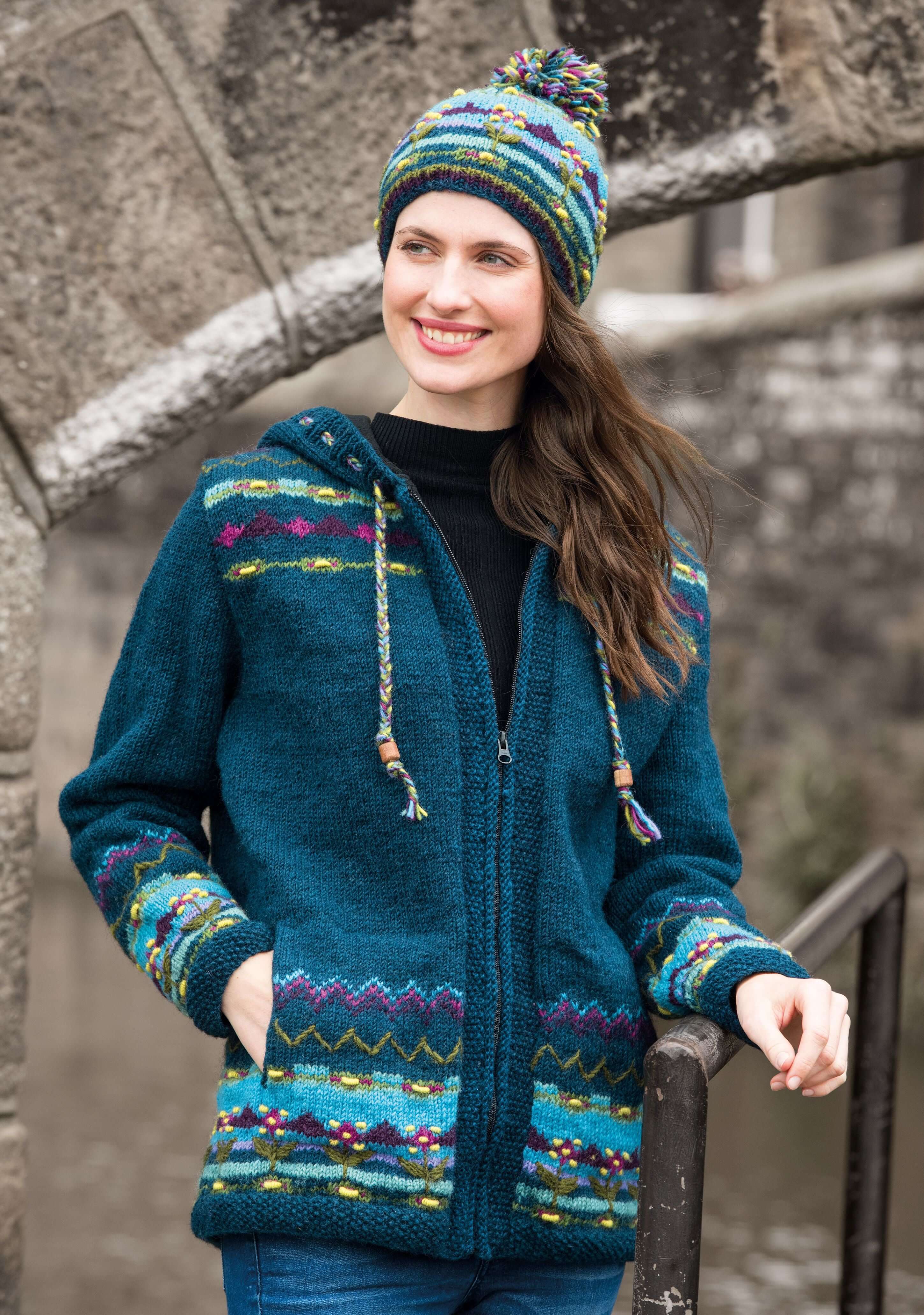 Hand knitted fine wool fleece lined zip jacket with hood in a beautiful rich teal colour with delicate hand embroidery, embracing traditional artisan skill. The fine wool yarn used to make this jacket allows for a more complex pattern, as well as allowing for richer and deeper colours, the perfect winter wardrobe item.
