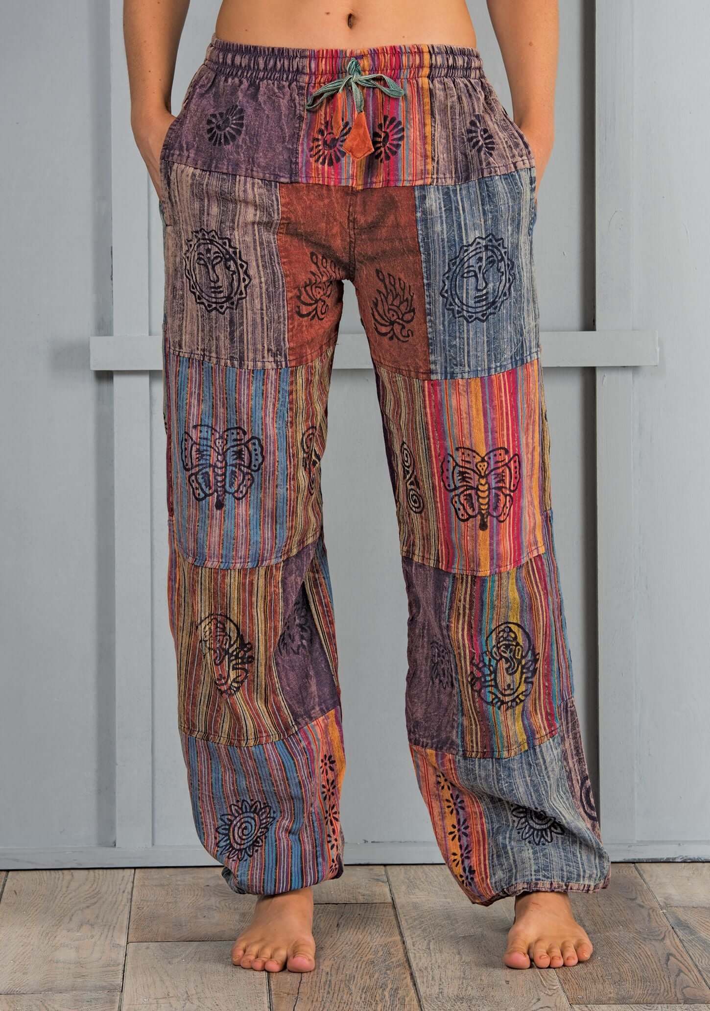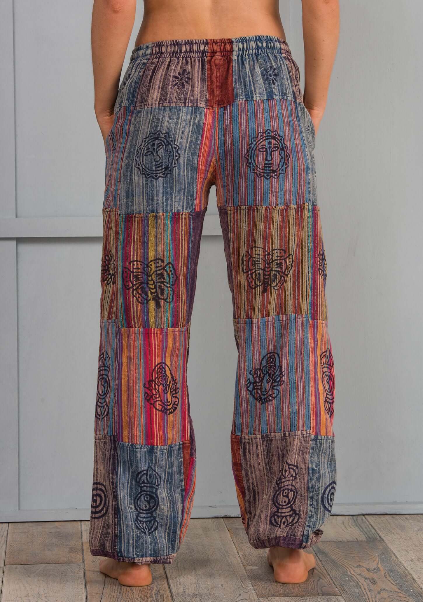 These easy to wear trousers are made with random block printed patches, they have an easy fit elasticated waist and are designed to be unisex.