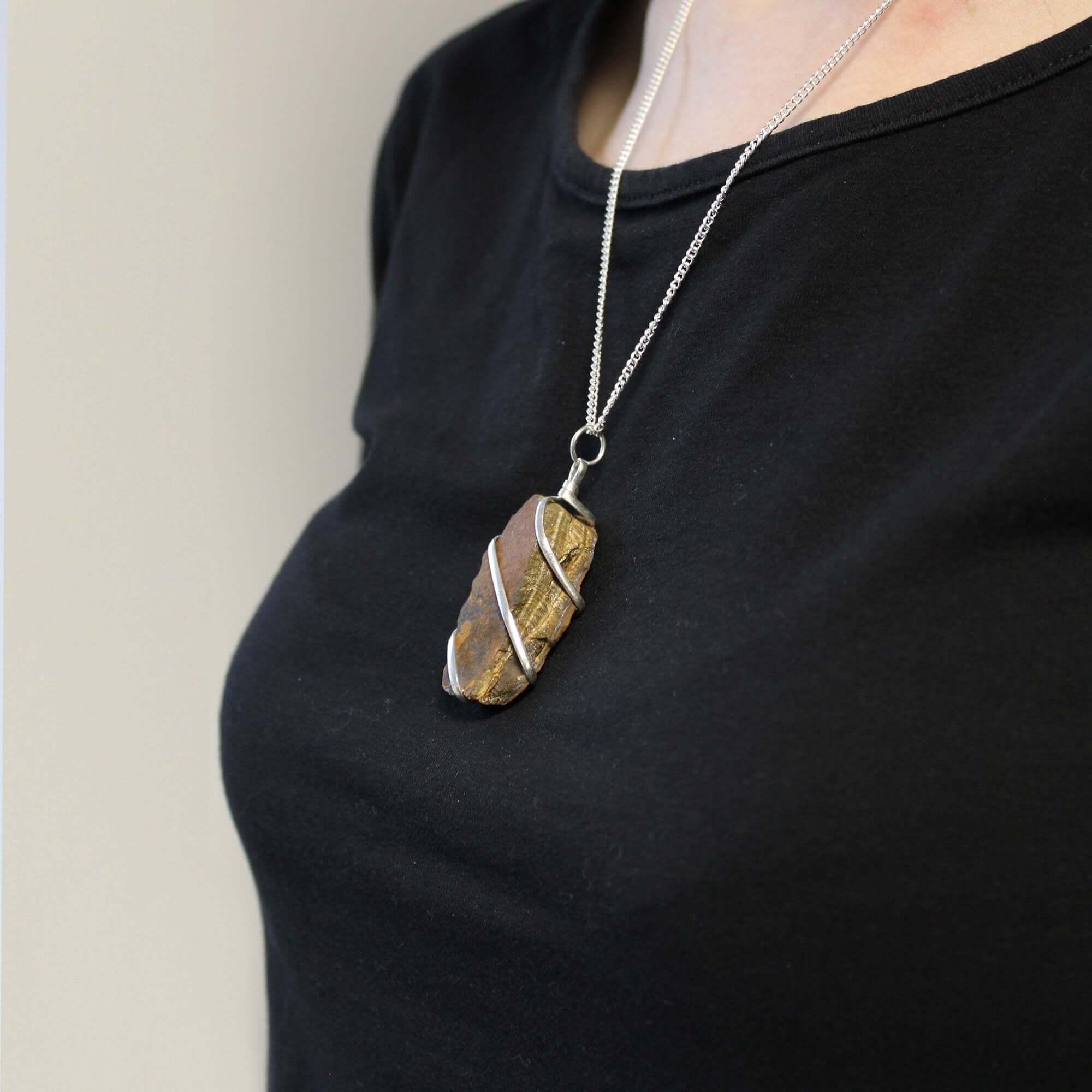 The Tiger Eye Necklace is jewellery that successfully combines raw natural stone with an elegant look. This lovely necklace will fit even the boldest outfit. The stone is cascade wrapped into thin wires.