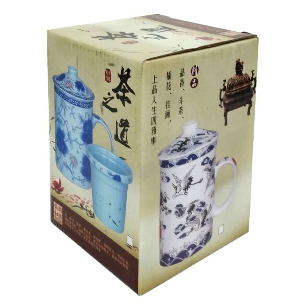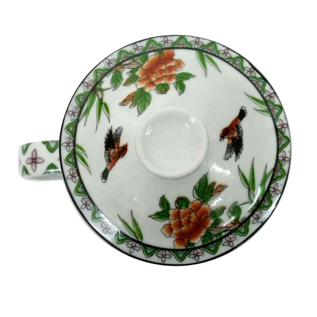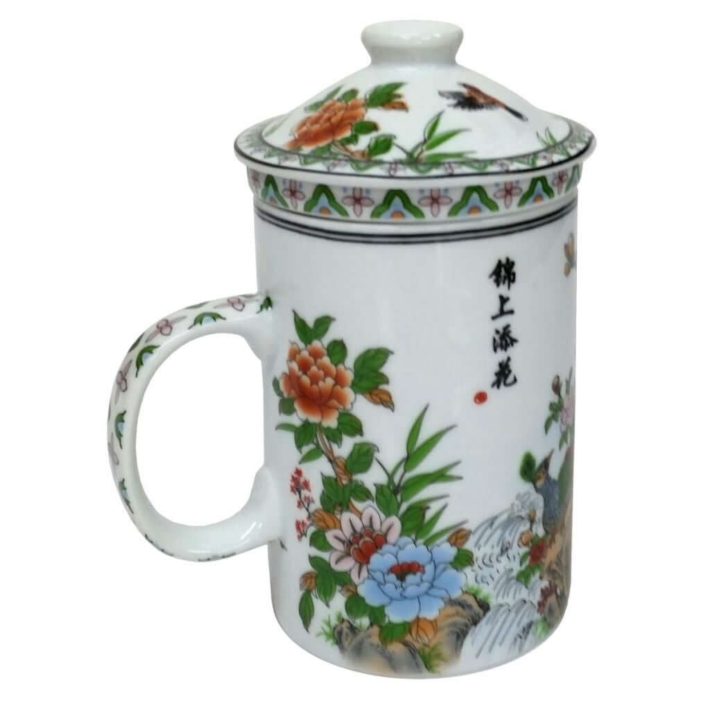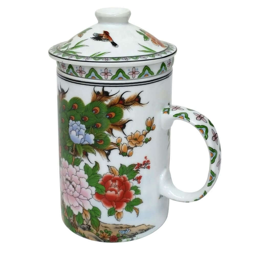An exquisite porcelain mug adorned with an enchanting peacock design, set amidst a vibrant flower garden. Savor the authentic flavors of Chinese tea with the included porcelain strainer insert, while the matching lid keeps your tea delightfully warm. Measuring at 7.5cm in diameter and 11cm in height (14cm with infuser and lid) and with a capacity of 300ml, this mug is perfect for indulging in a moment of tranquility. Made from high-quality porcelain, it is both dishwasher and microwave safe, ensuring convenience and durability. Elevate your teatime rituals with this luxurious tea mug.