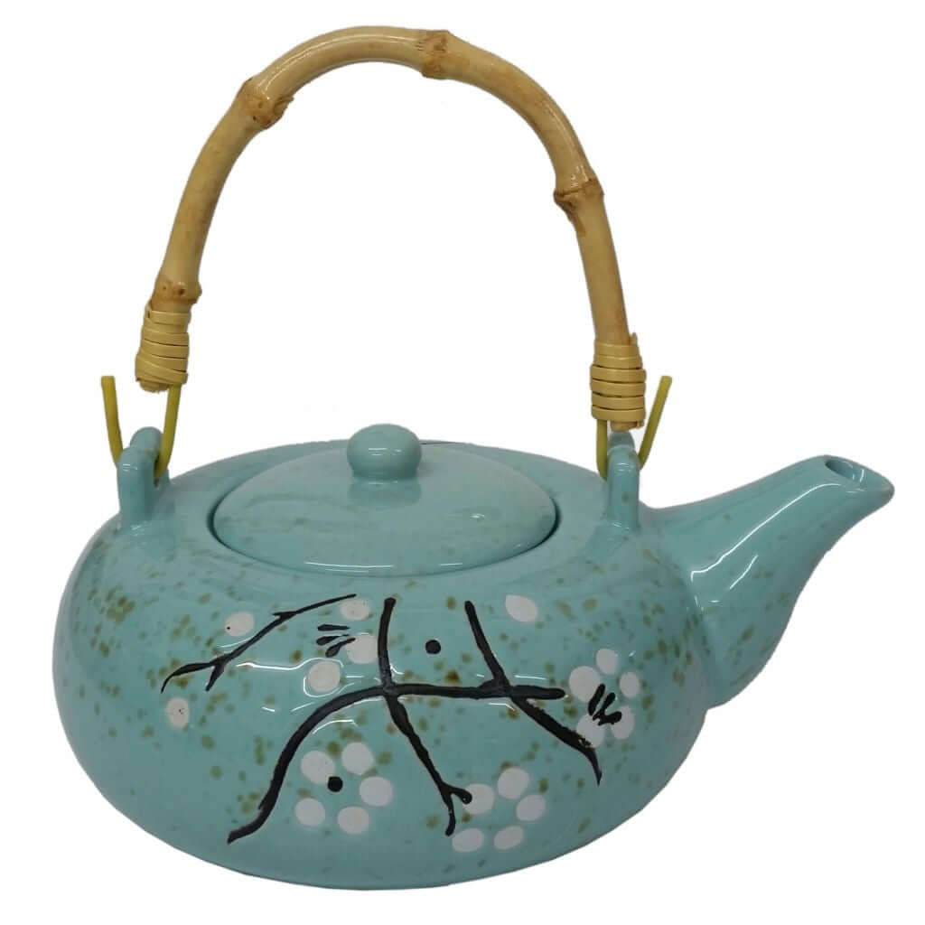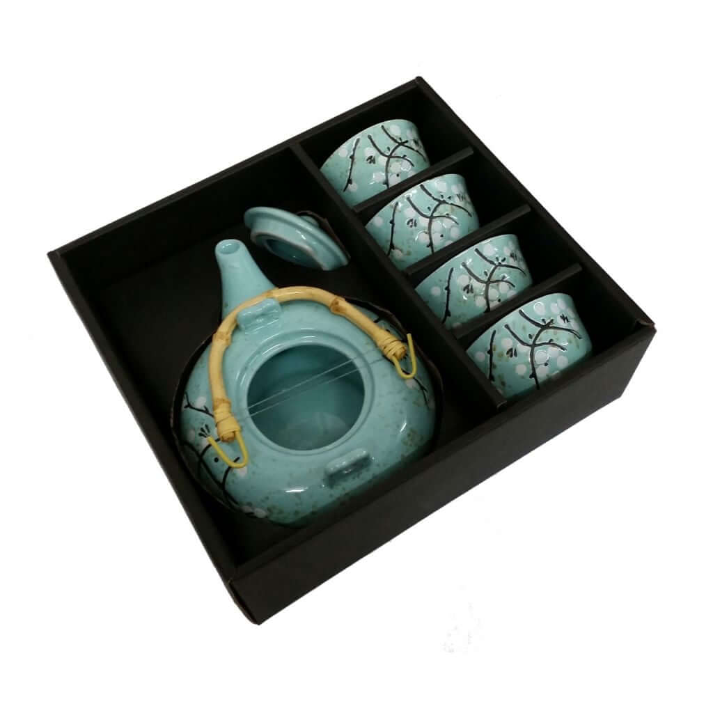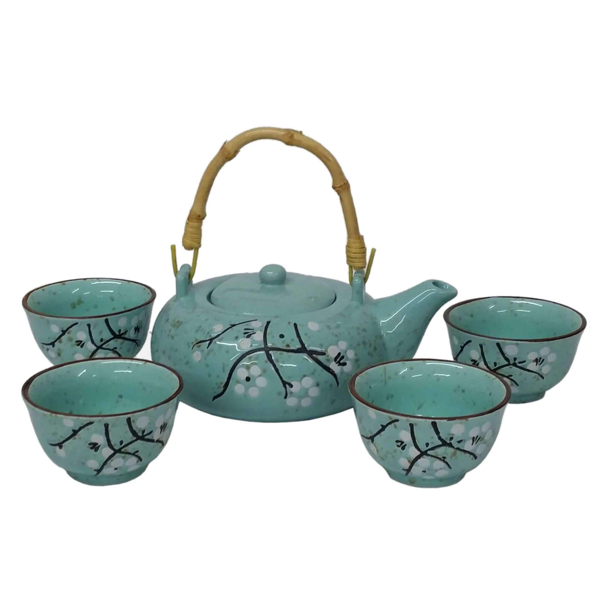 Sprigs of white flowers on duck-egg blue teapot and cup set. Includes flexible bamboo handle and four matching cups.