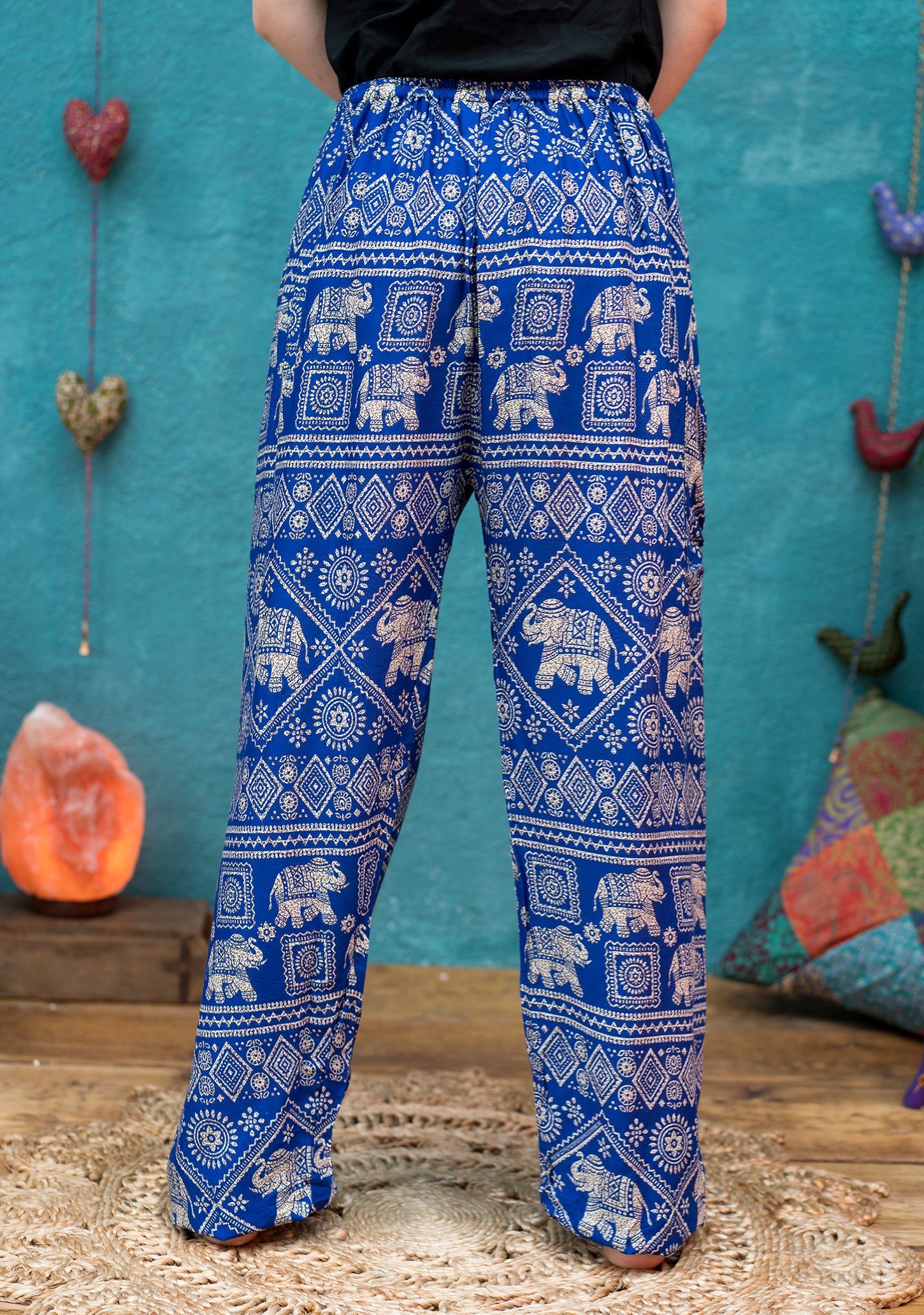 These harem trousers feature a chic elephant print and an elasticated waist with a white plaited pull cord. The lightweight fabric is gathered at the ankles and includes a side patch pocket for added convenience. Perfect for various occasions, they offer ultimate comfort and easy movement, making them a must-have for festivals, leisure, beach holidays, travel, yoga, pilates, nightwear, or loungewear. Additionally, these pants are quick-drying for added practicality.