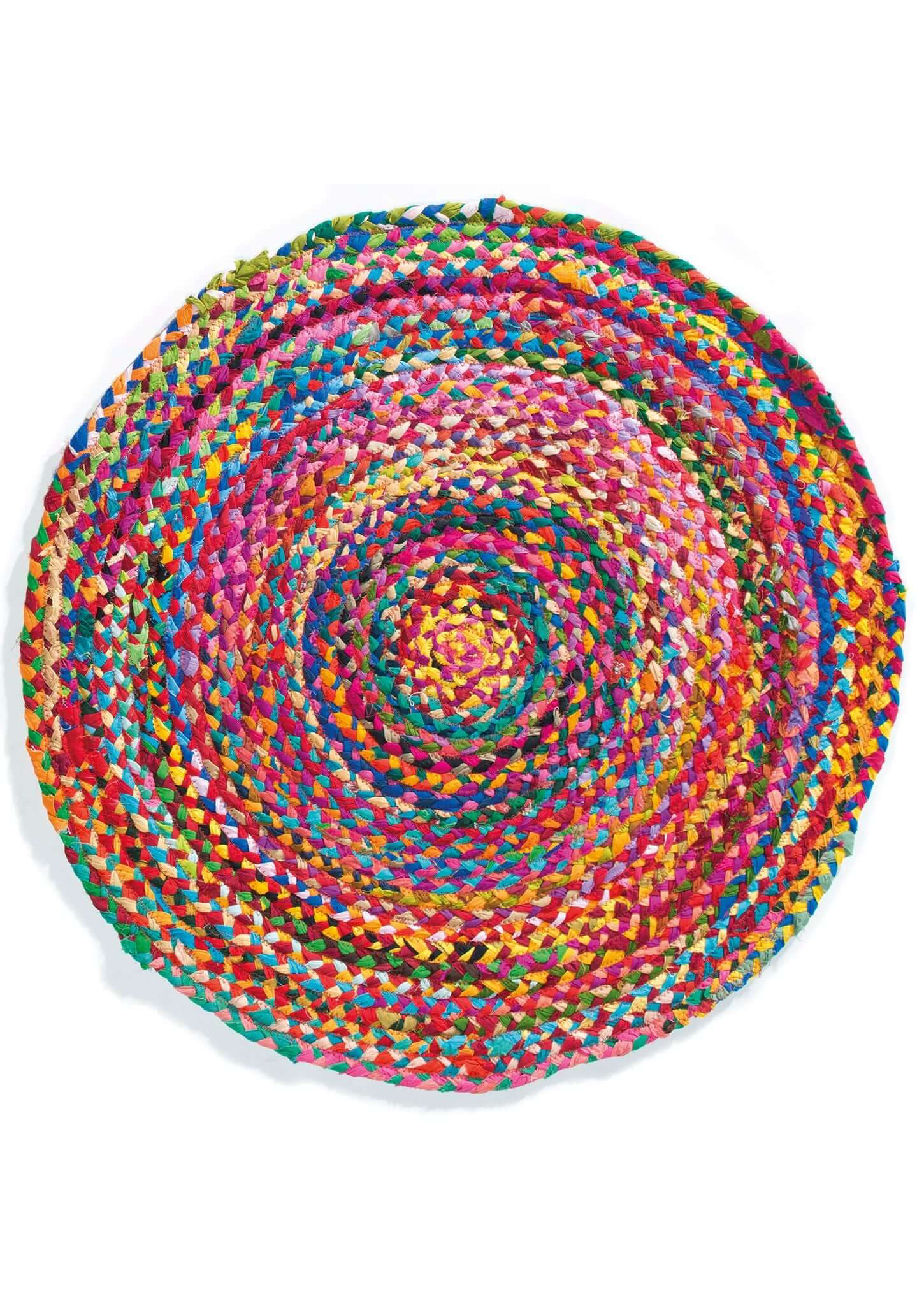- These Multi-coloured Braided Chindi Rag Rug feature stitching of thicker fabric strips woven to produce a dashed stripe effect on a striped spiral background.