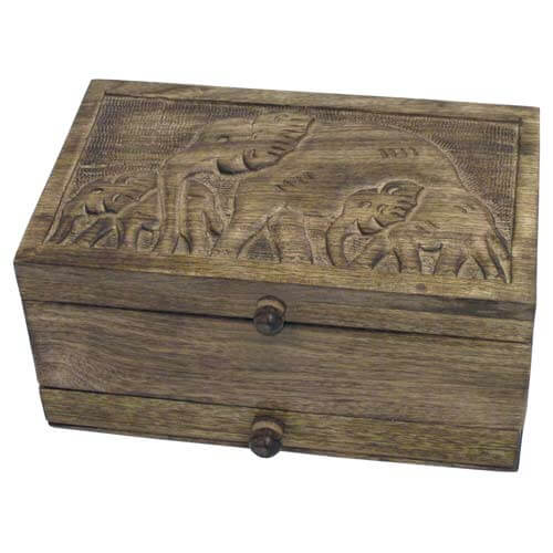 This features a carved image of elephants on the mirrored lid, a drawer and a lift out tray with a compartment below.