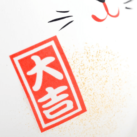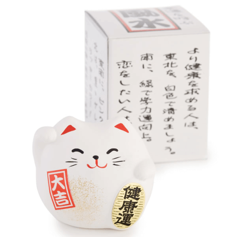 The cat has a mat white glaze with a sprinkling of gold on its front. The cat has its right paw raised to bring in prosperity into your home. The colour white will help to enhance good health in your home.
