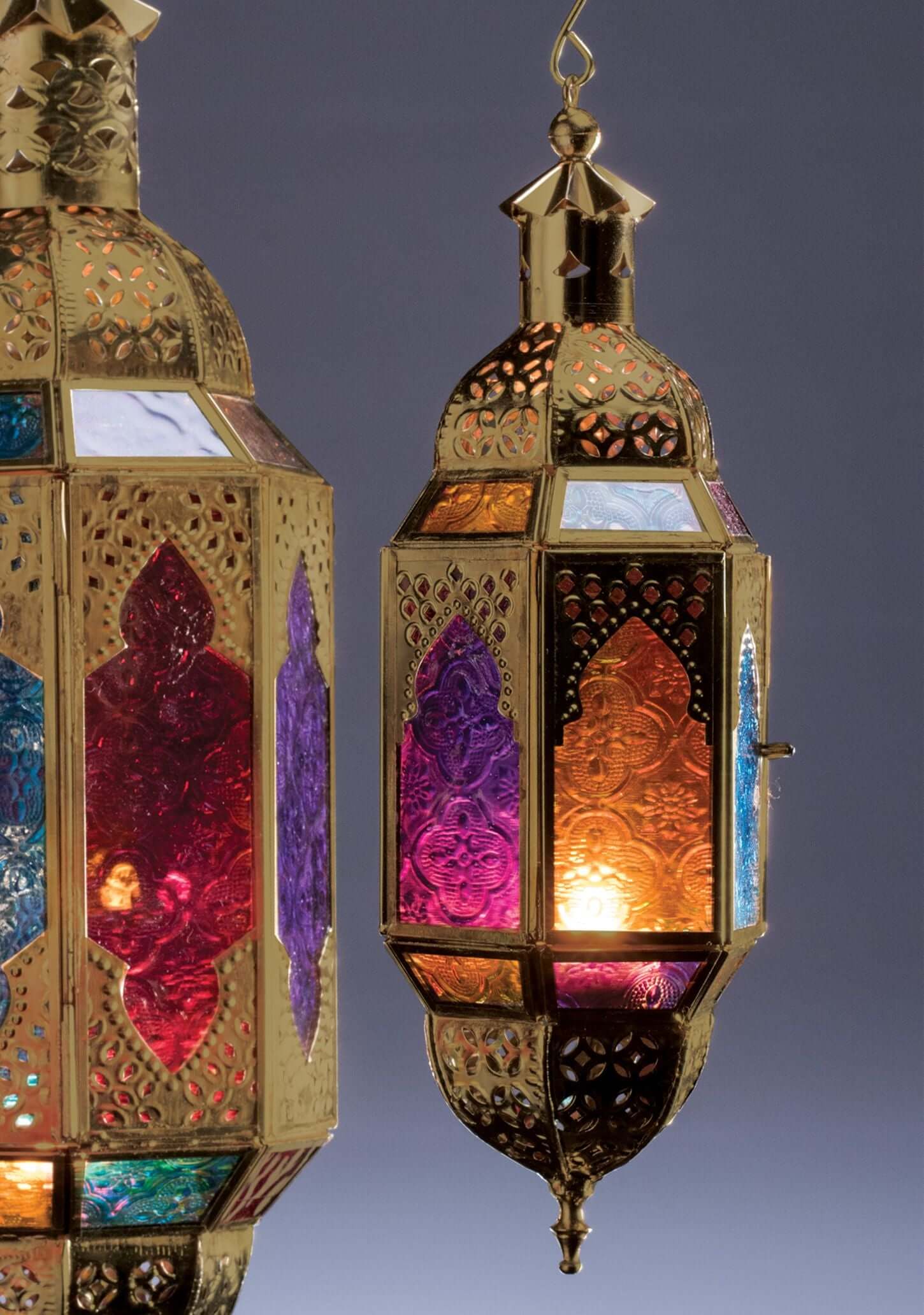 Handmade in a small workshop in Northern India on a Fair Trade basis, these beautiful hanging gold finish multi glass lanterns come in rich and lustrous colours that catch the eye and instantly add atmosphere to any room.