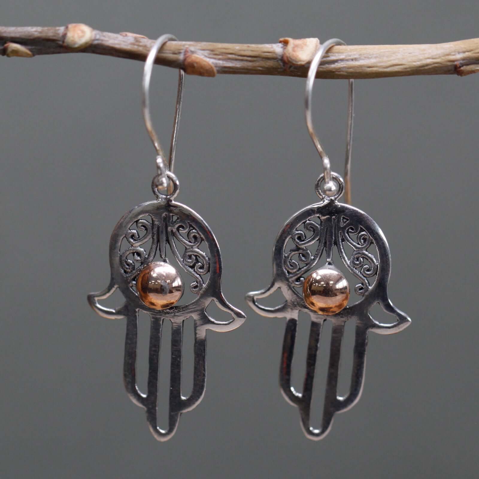 Gorgeous pair of Silver and Gold Hamsa design earrings with an exotic mystic feel. The beautiful packaging compliments the product making this is a special gift for someone. When you open the gift box on this silver jewellery you can see it says "..wear with confidence.."not just because it is beautiful - but also because it is ethically sourced in Indonesia