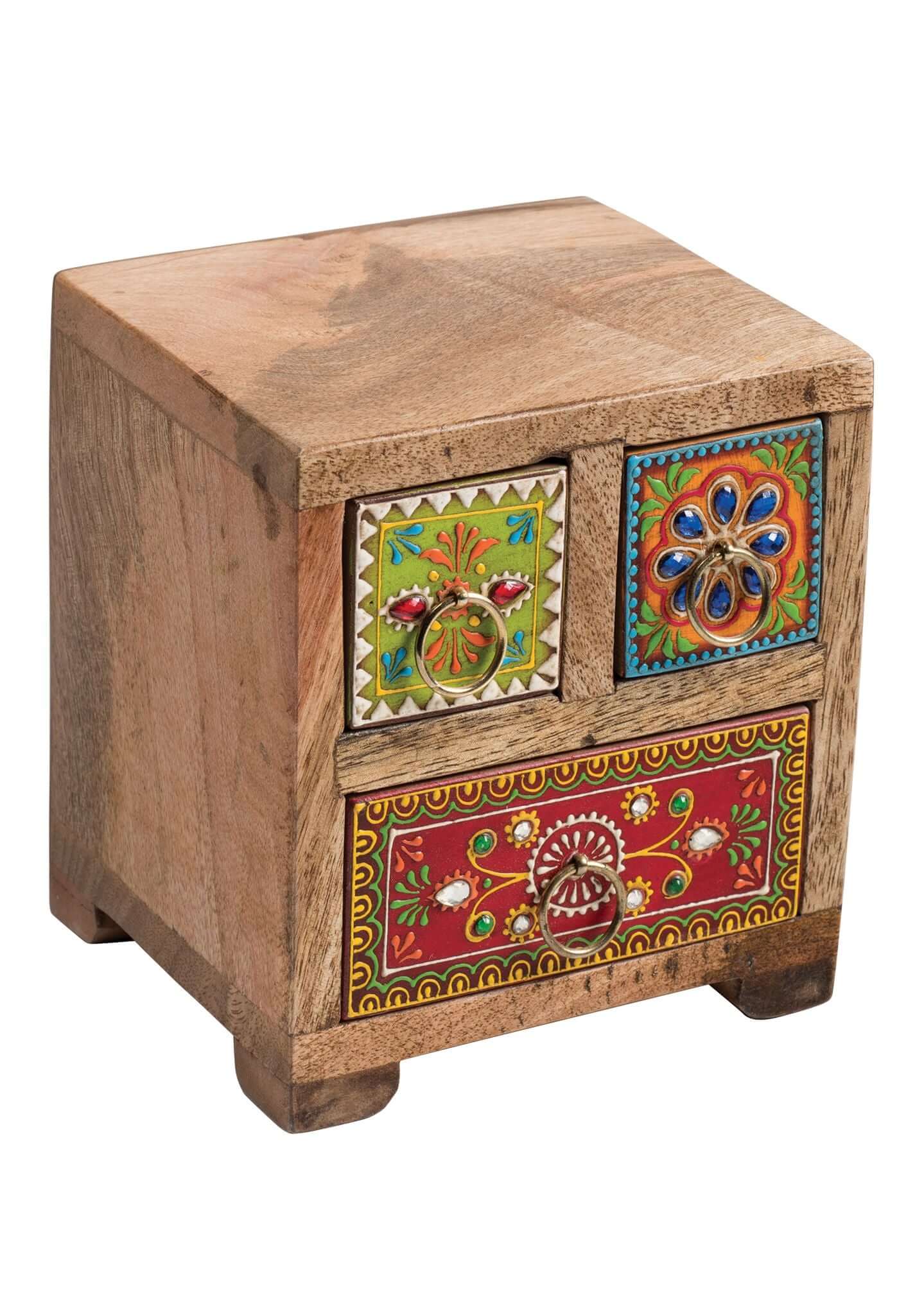 The Hindi word 'Sankalaka' is translated as 'eclectic'. The random application of skilfully painted drawer panels results in this beautiful, eclectic, unique 3-drawer chest. Each panel is hand painted to perfection by highly skilled artisans.