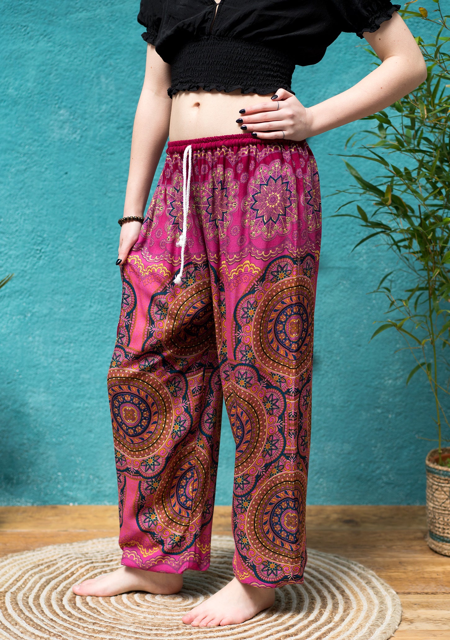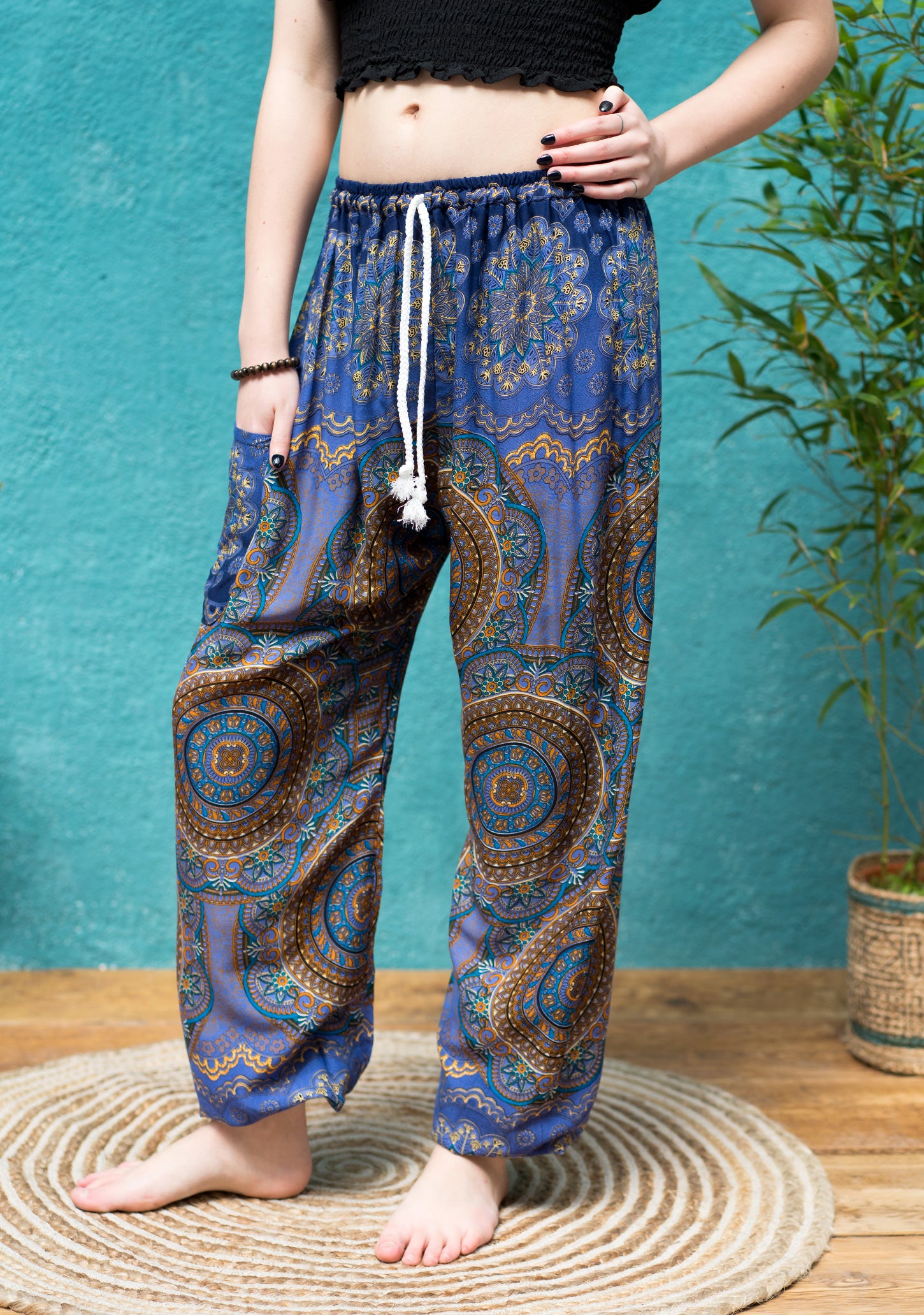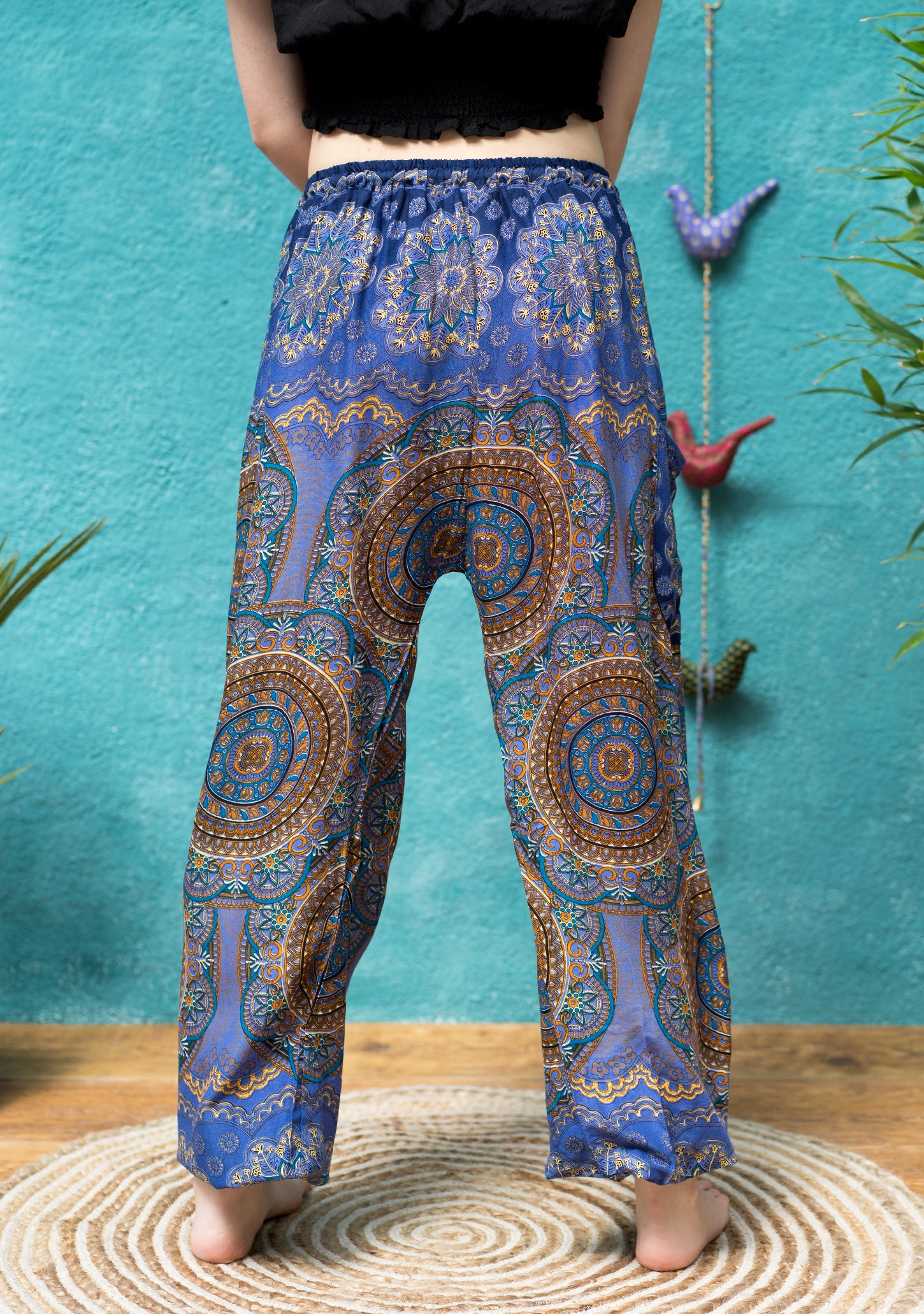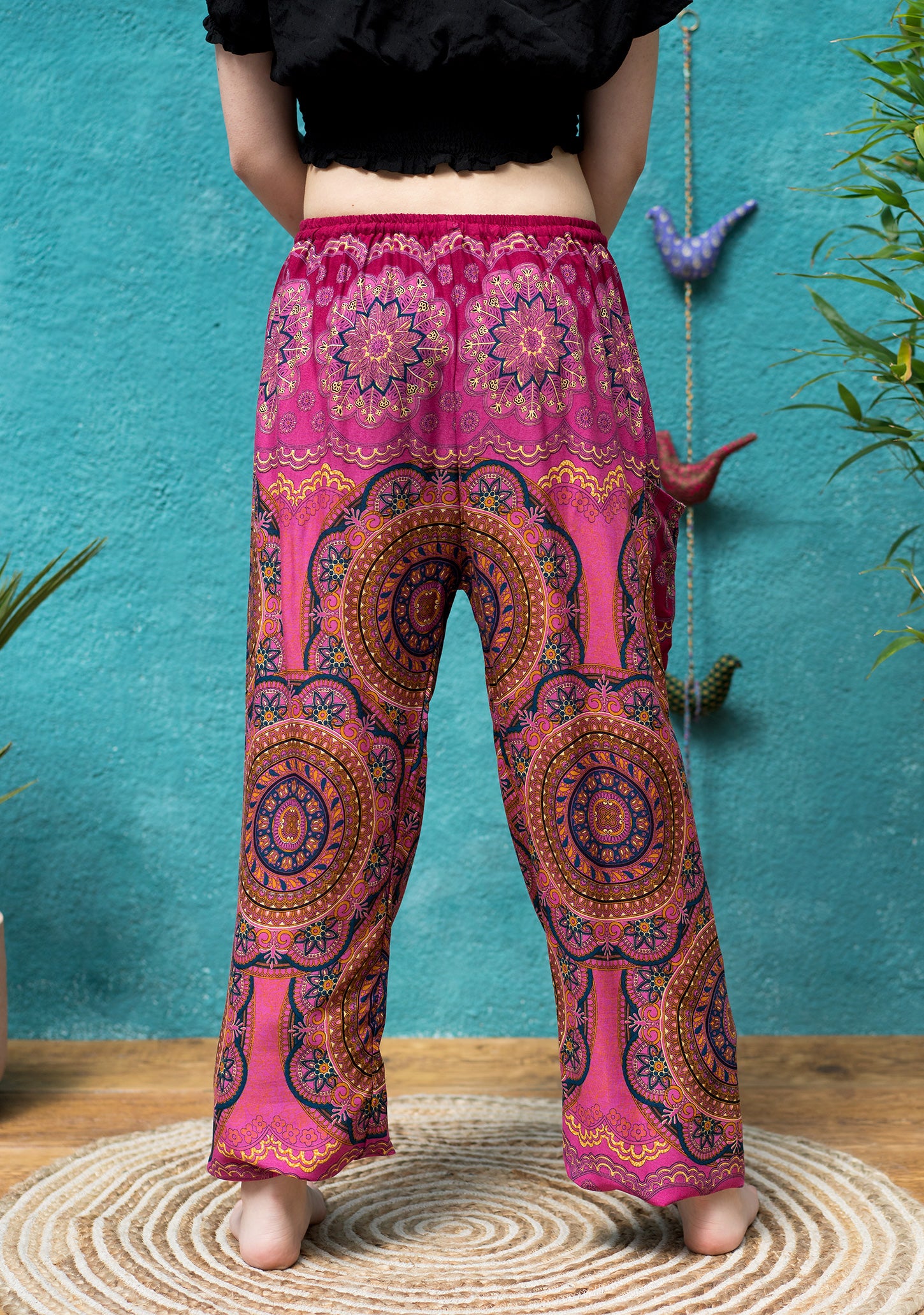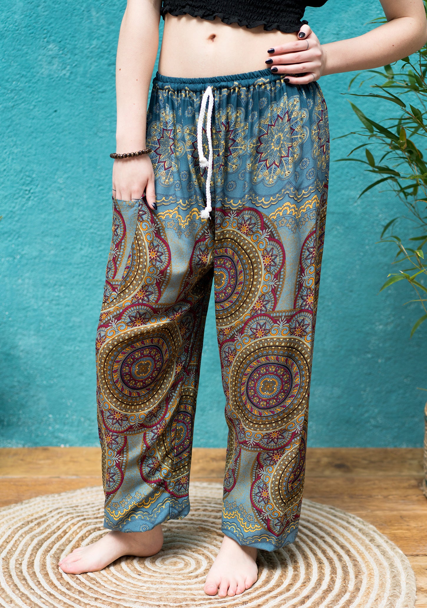 Available in various colours, these womens harem trousers feature a striking mandala print. Designed for a relaxed fit, they come with a white plaited cord drawstring waist, elasticized ankles, and a side patch pocket. Versatile and stylish, these pants are perfect for a range of activities such as festivals, vacations, yoga, and lounging. They are made to fit all sizes and are available in a selection of colours.