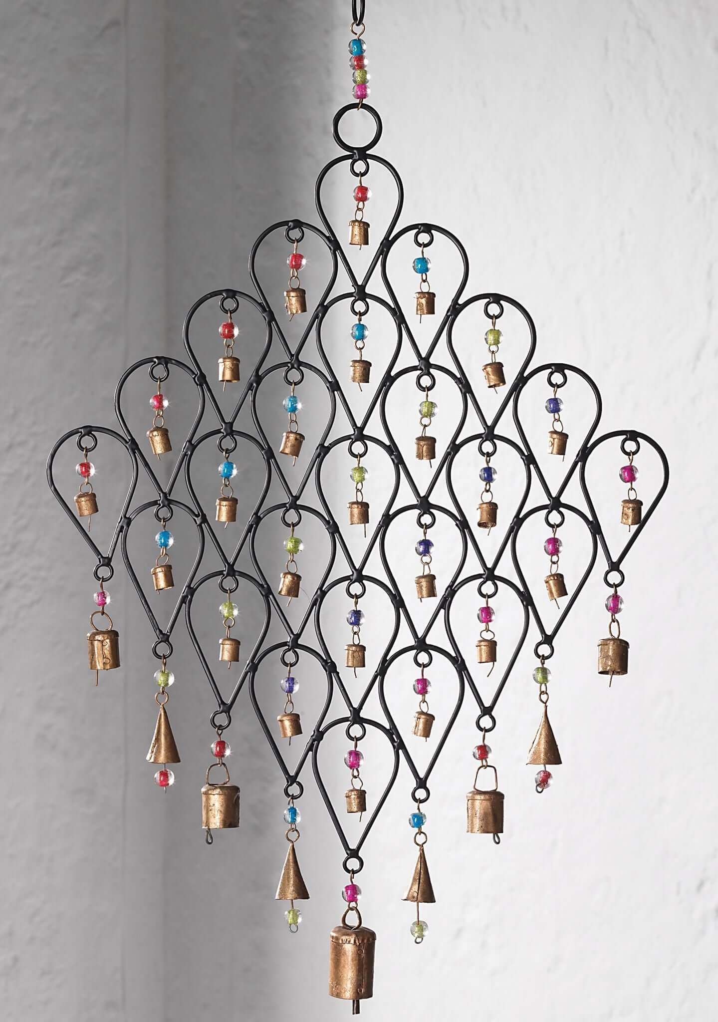 | Made from recycled iron using traditional iron-working skills, this hanging wind chime is adorned with a variety of iron bells and pretty coloured glass beads, making it both aesthetically pleasing and euphonious Size: 41 x 69cm Recycled Iron Crafts Handmade In India |