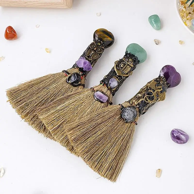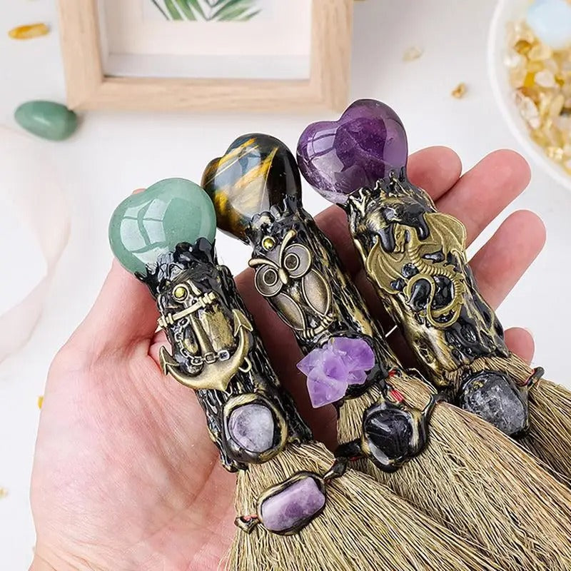The Natural Crystal Magic Broom is a versatile tool that not only cleanses but also adds a touch of witchy elegance to any space, our gemstone Wicca brooms are handcrafted with Crystal gemstones.