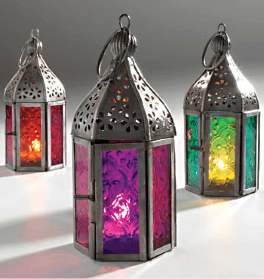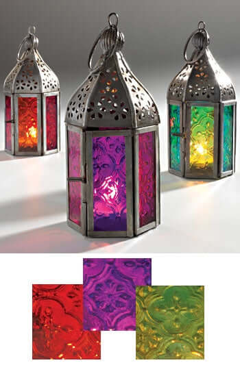 Moroccan Style Mini Glass Lanterns made from metal with two tones of patterned glass panes.