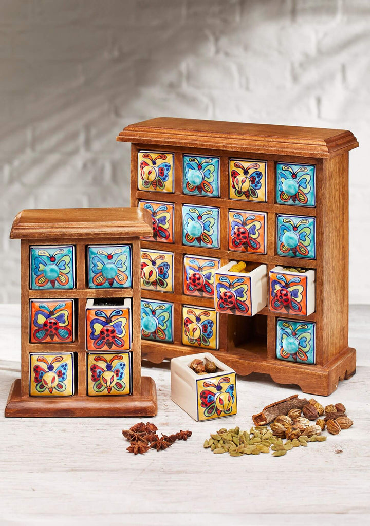 Ceramic spice chest with each of the 6 miniature drawer fronts hand painted with an open winged butterfly, cleverly concealing pull out handles in the design. Motifs in variations of blue/green, pink and yellow finished to a shine glaze to highlight the colours beautifully against the warm wood texture. Presenting a charming way to keep spices, teas and dried herbs, but also a multi-purpose storage solution for jewellery, trinkets, arts and crafts materials or haberdashery. Beautifully handmade, this is a genuine traditional Indian treasure chest.