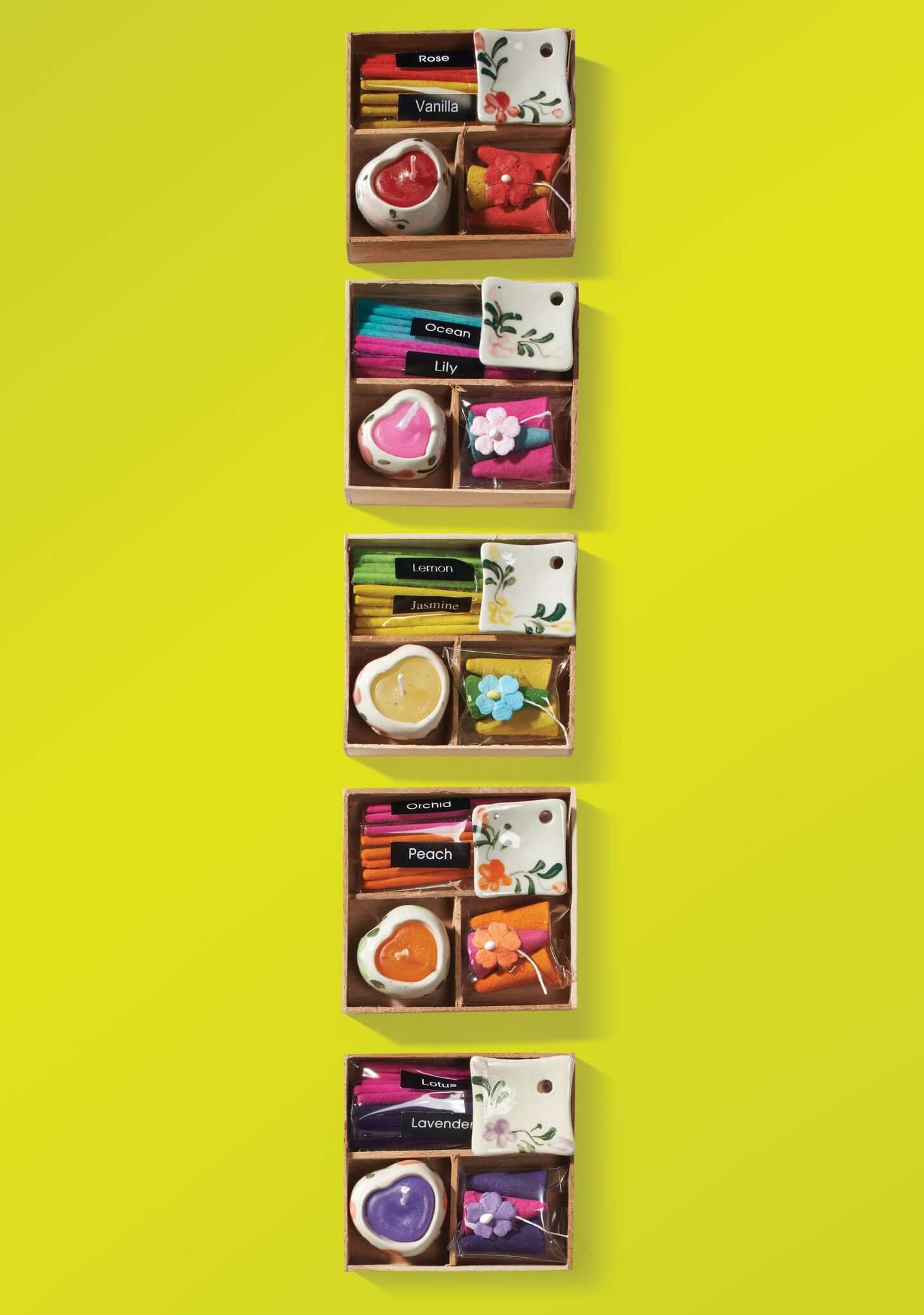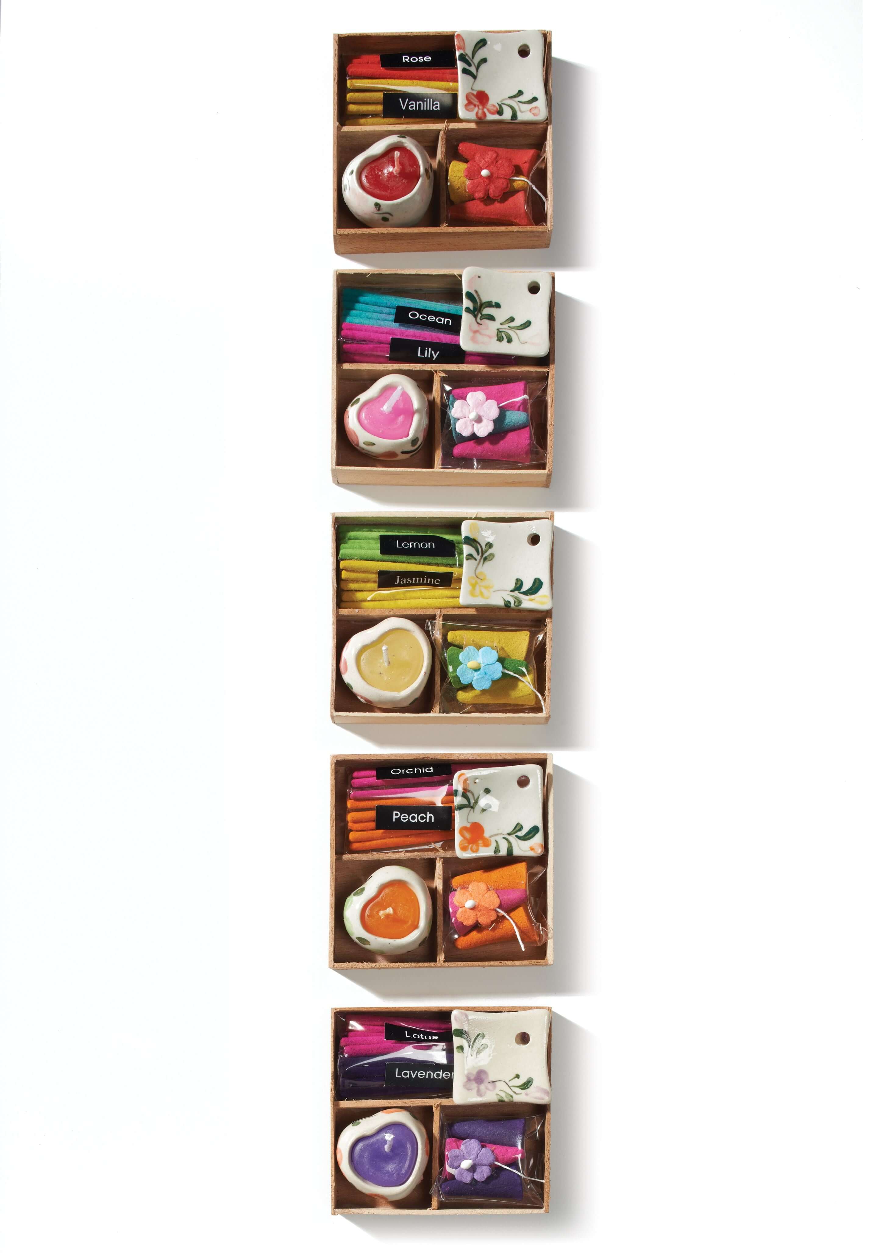 A small incense and candle gift set containing one small heart shaped ceramic candle with two packs of small incense sticks and ceramic holder.