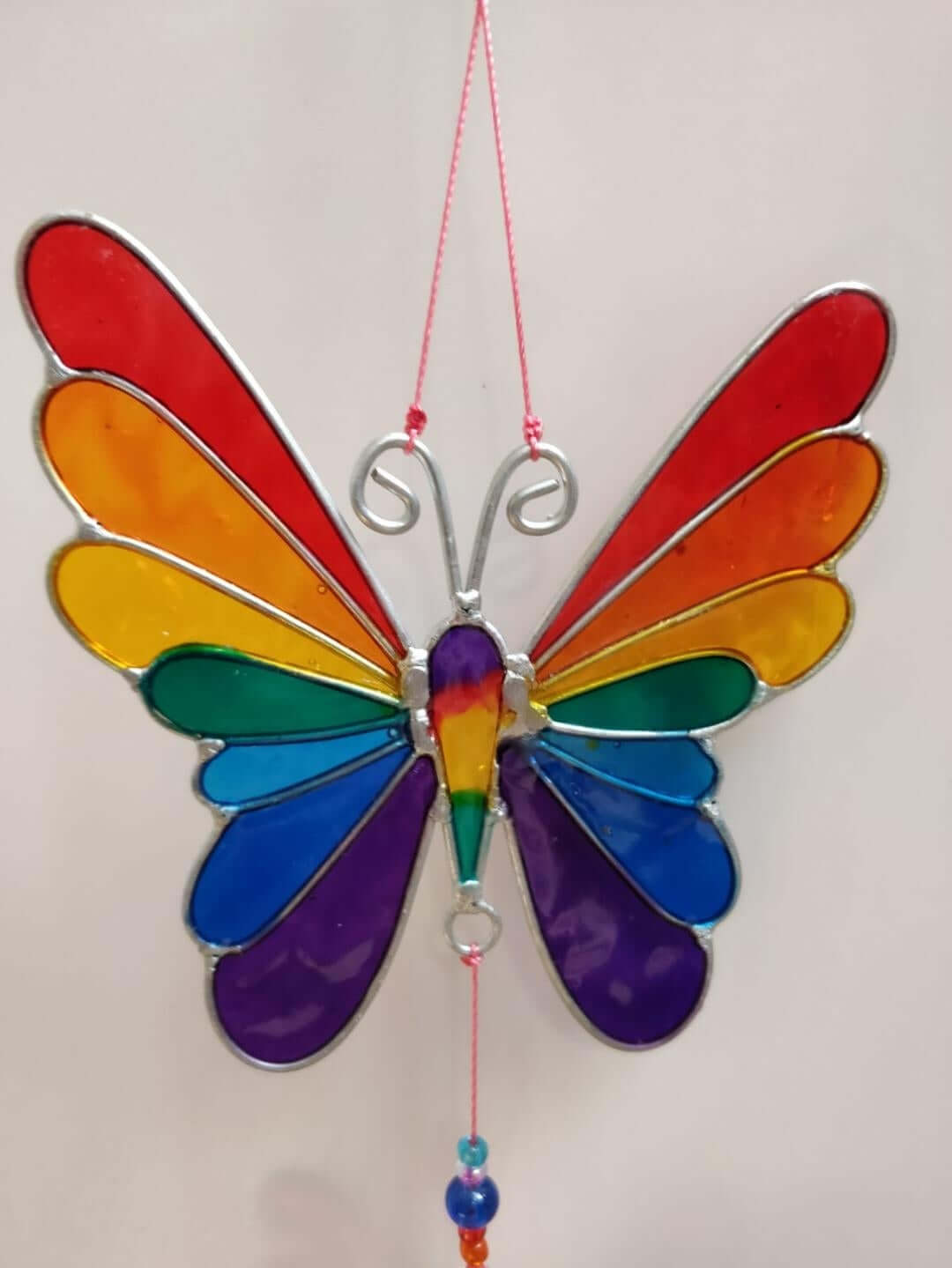 String of 3 colourful resin butterflies suncatcher with beads, lovely for the home or summer house in the garden. Each wire mould is made by hand and hammered flat, resin is then poured in, allowed to set and then each piece is hand finished by decorating with beads, producing a beautiful finished article.