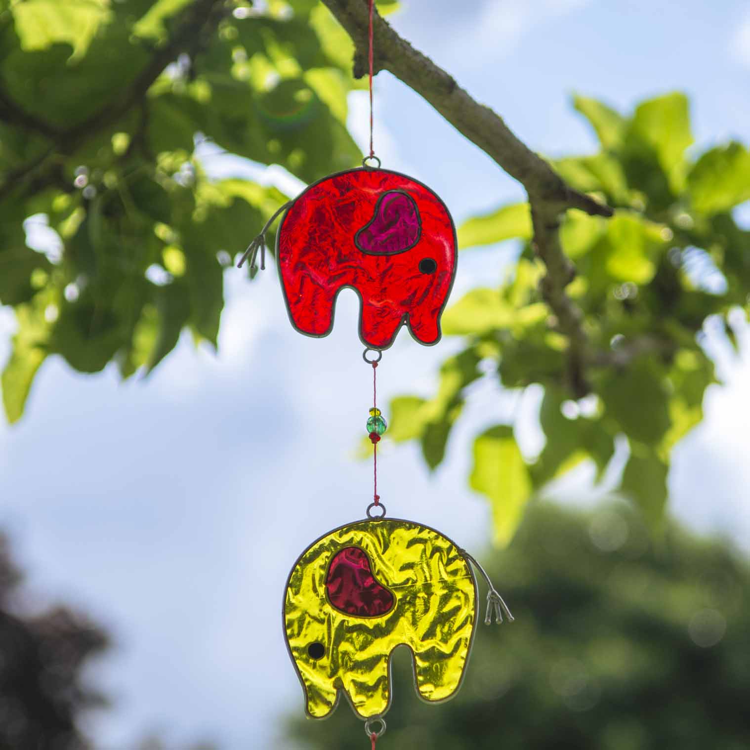 Fun and quirky string of 5 elephants and hearts suncatcher. Each wire mould is made by hand and hammered flat, resin is then poured in, allowed to set and then each piece is hand finished producing a beautiful finished article.