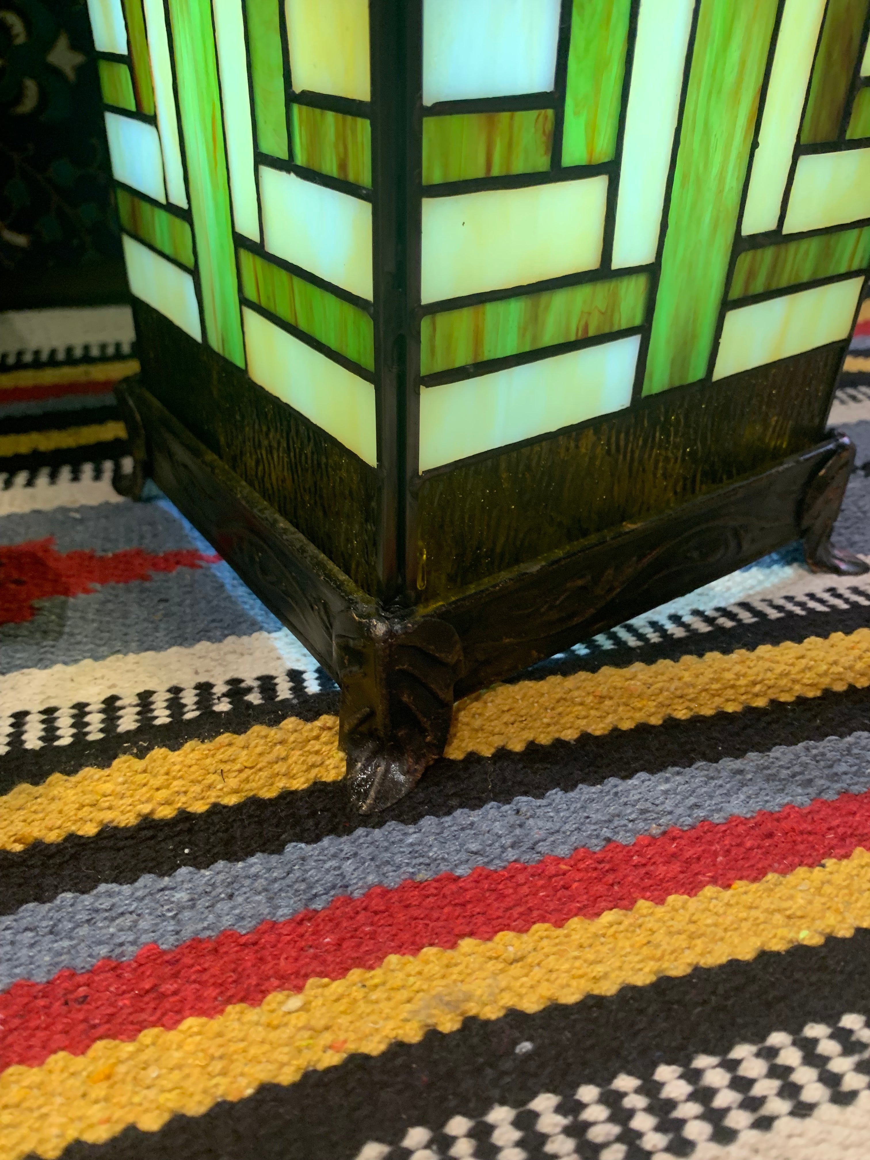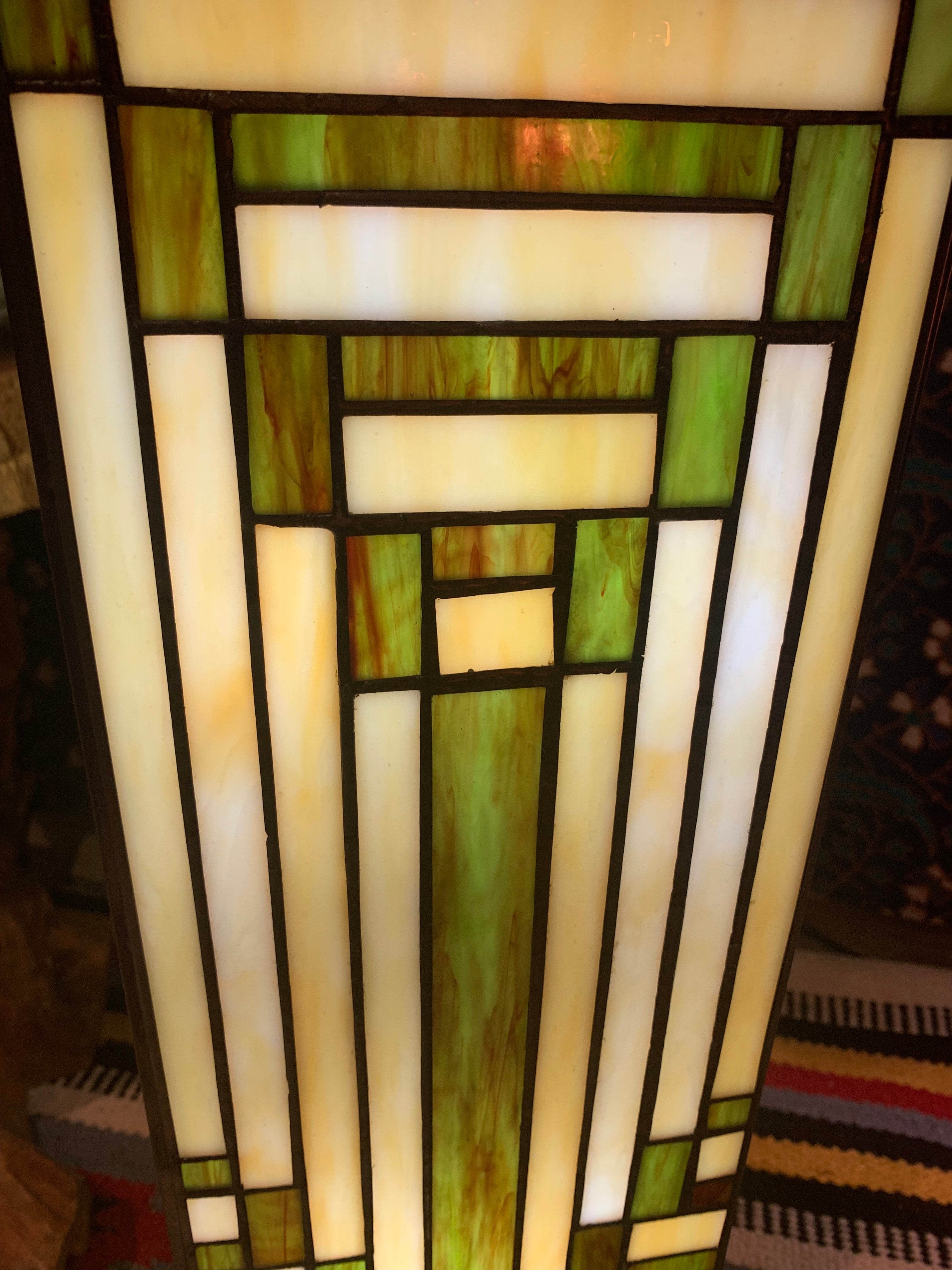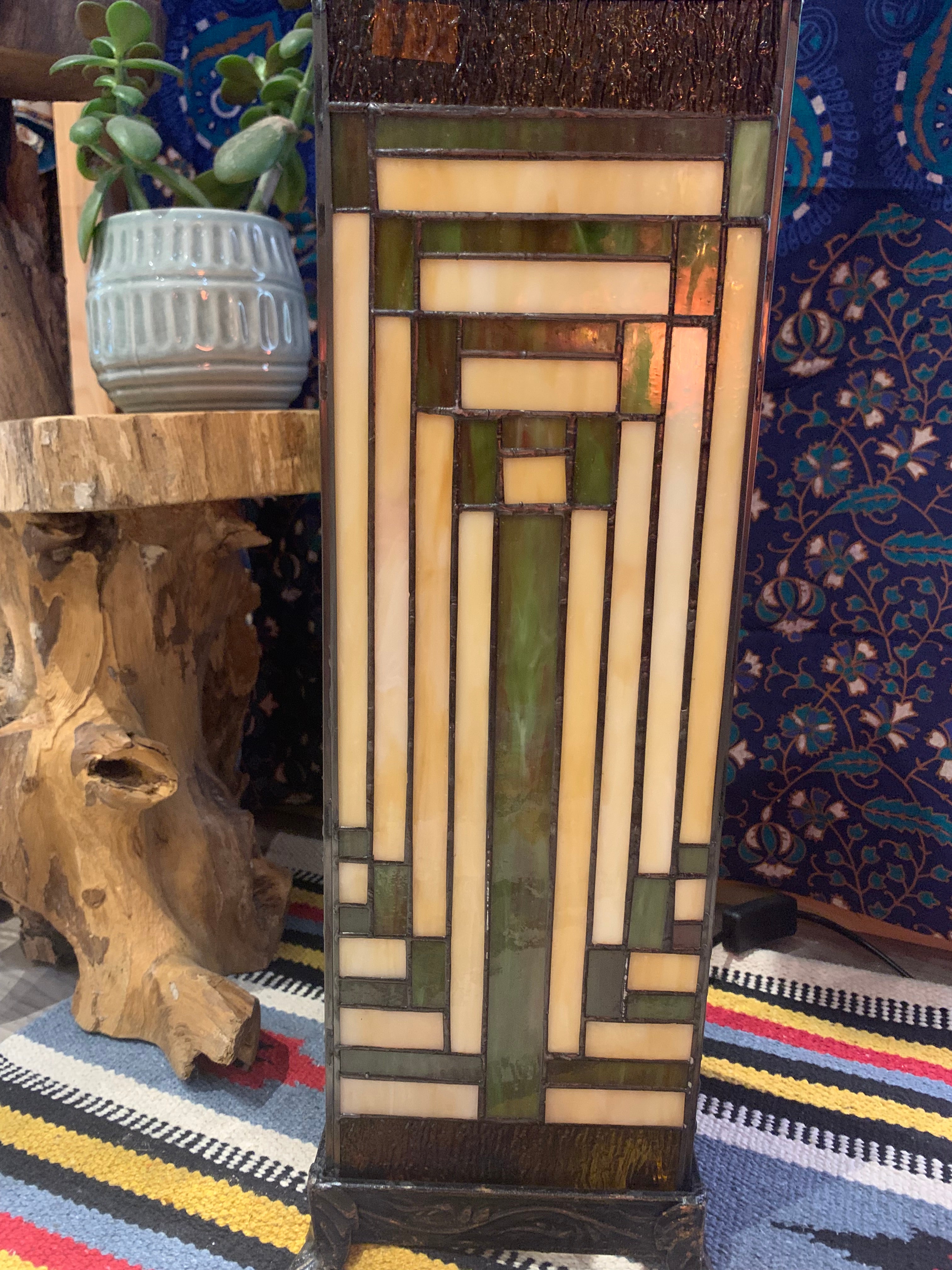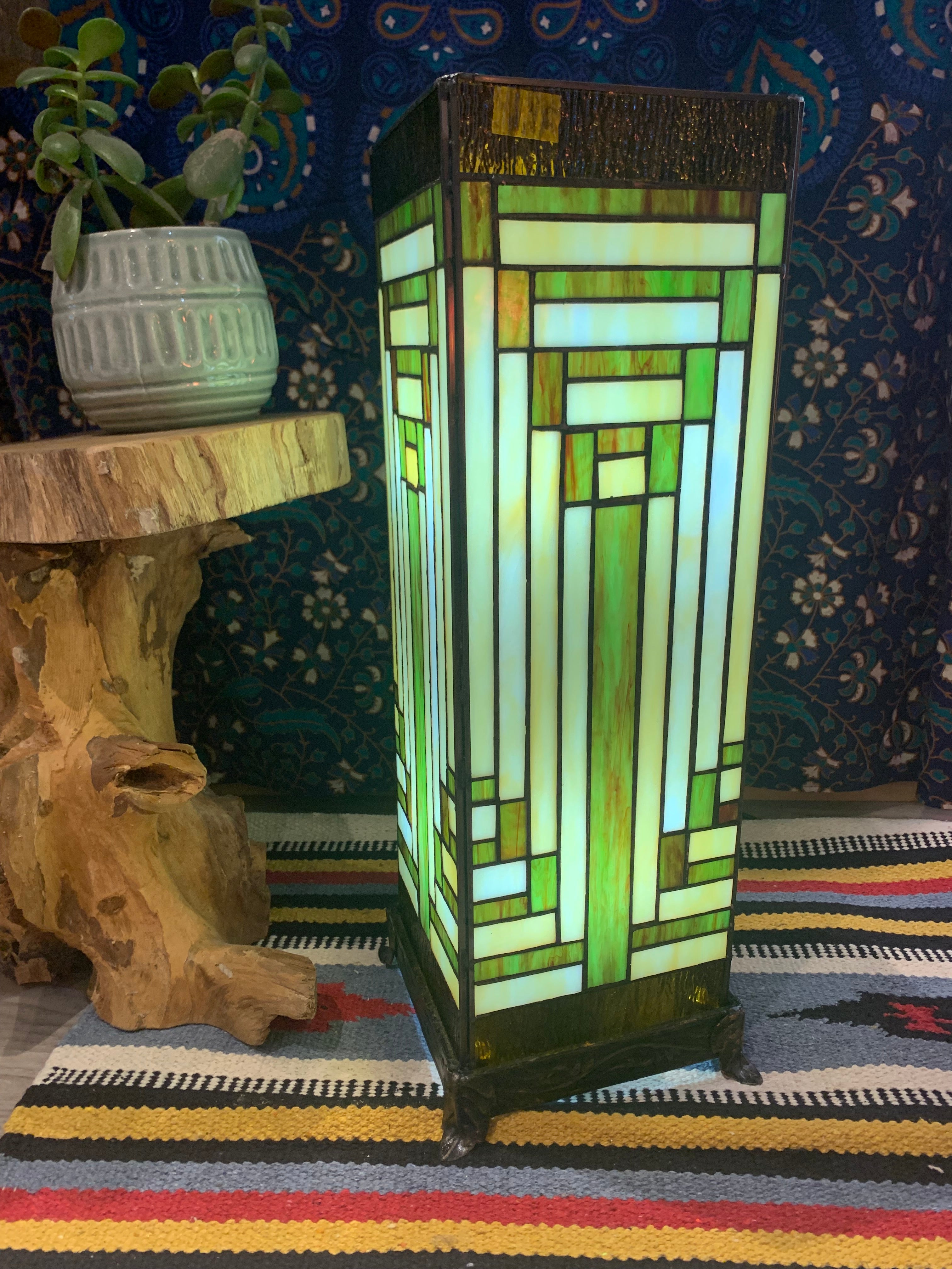 Our lovely Art Deco design Tiffany Style lamp shade is made from Favrile (meaning handcrafted) stained or iridescent glass. The shade is handmade from individual cut pieces of glass which are assembled like a jigsaw and soldered together. Approximate Size: H: 47cm x W: 18.5cm x D: 18.5cmCable Length Approx 1.6/1.8m - With Inline Switch Uses 2 Pygmy/Candle Light Bulb SES/E14 25W Max. Please note colour may vary slightly due to lighting conditions when photographed. |