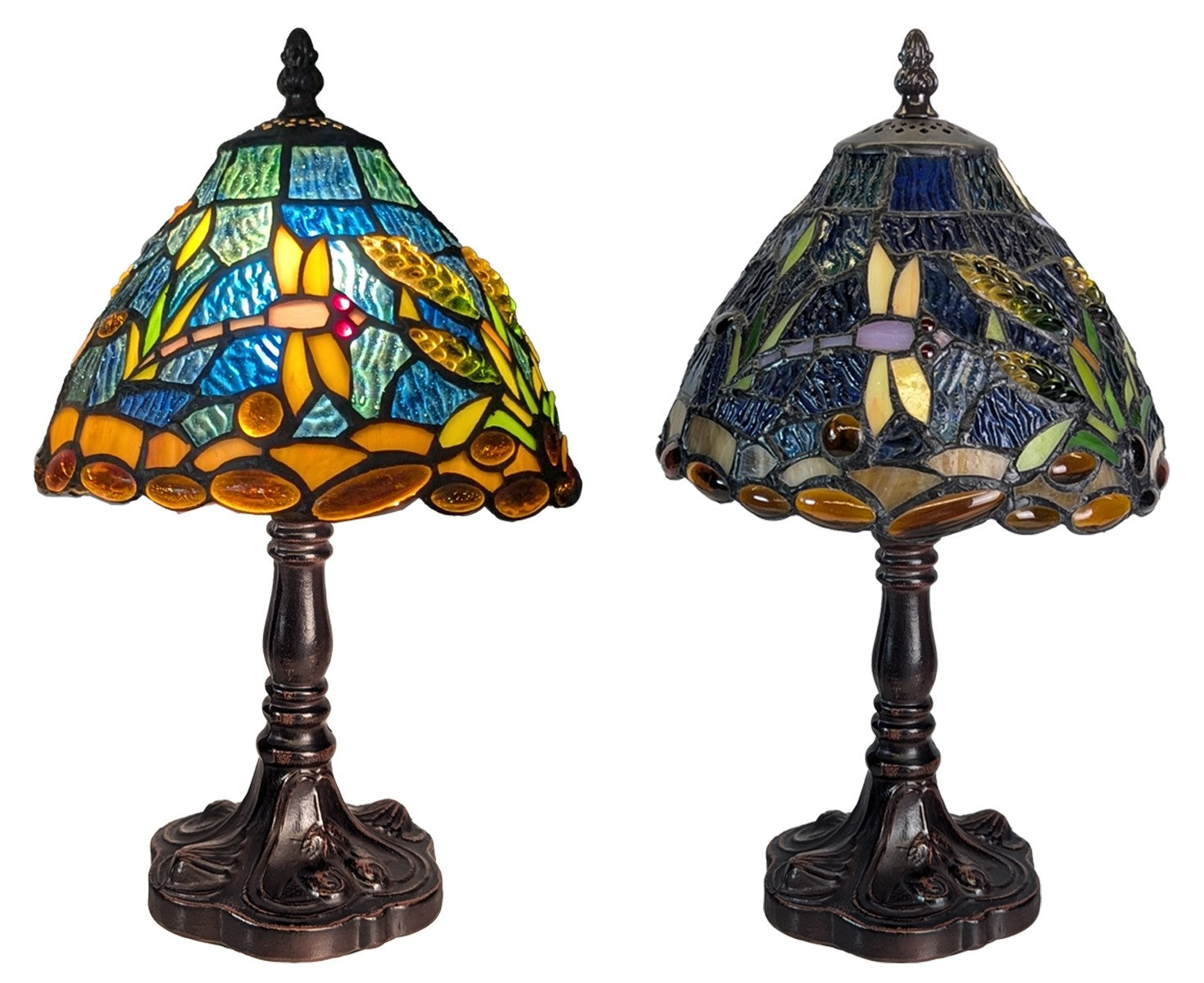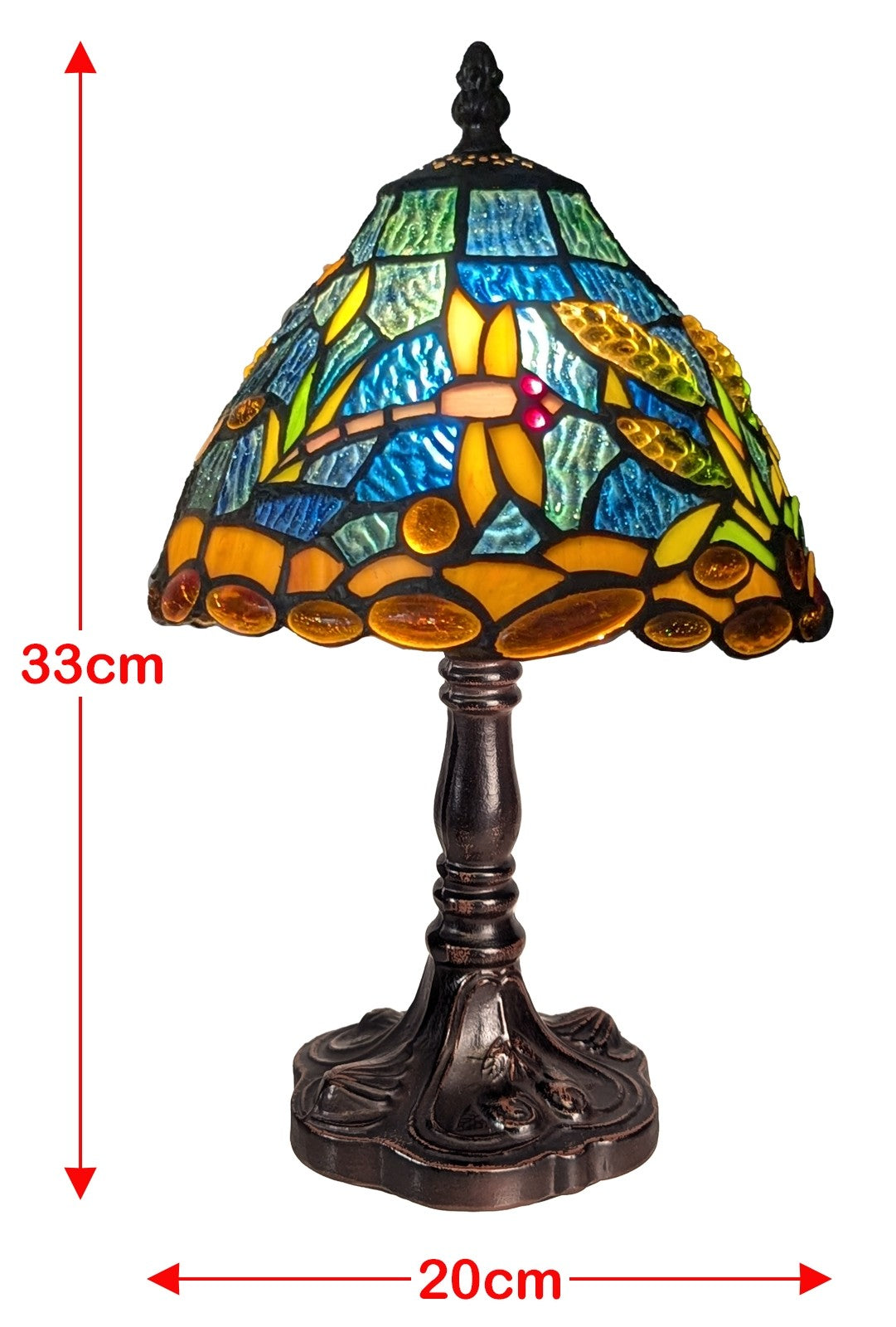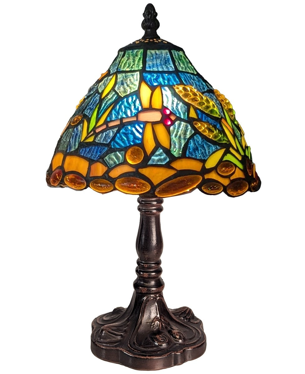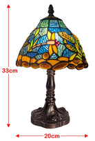Enhance your space with the elegant Riverbank and Dragonfly Tiffany table lamp. Featuring a finely crafted die cast zinc alloy base and vibrant favrile glass, this lamp captivates with its detailed dragonfly and riverbank design. Compact yet eye-catching, it provides warm ambient light ideal for living rooms, bedrooms, or studies. Lightweight and sturdy, it’s simple to position and care for while adding a refined artistic touch. This lamp seamlessly blends style and function, making it a perfect statement piece for modern interiors seeking charm and craftsmanship. Ideal treat to yourself or gift to your loved ones on any occasion. Approximate Size: Height 33cm Width 20cm Depth20cm Cable Length Approx 1.6/1.8m - With Inline Switch Fitted with E14 / SES bulb, max 6W LED, requires 1 bulb, bulb is not included. Please note colour may vary slightly due to lighting conditions when photographed, due to handmade nature of this item, its size pattern and colour may vary slightly |