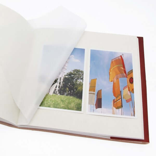 Each photo album is handmade and contains 30 pages of acid-free recycled paper, each interleaved with tissue paper, and can hold up to 120 standard 6 x 4" photos
