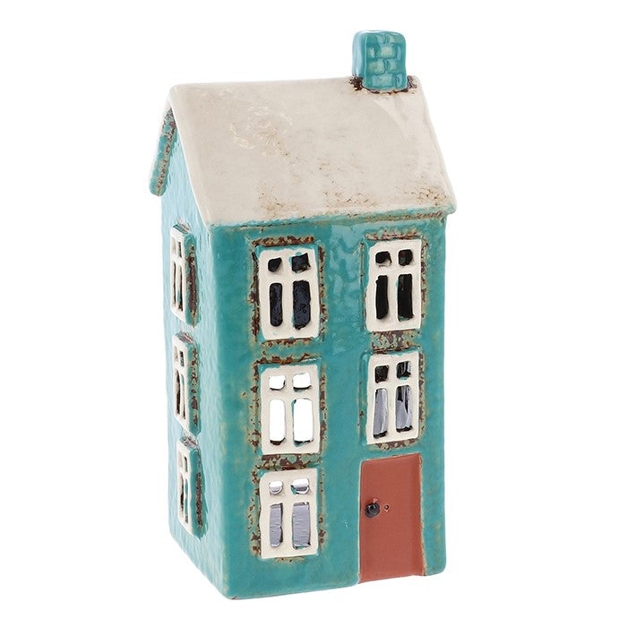 This cute ceramic Teal Tall house tea light holder is the perfect way to create a cosy ambience in your own home. It will look lovely when displayed on a shelf or windowsill.