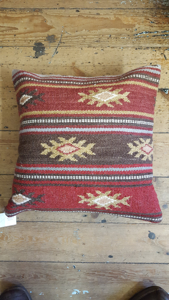 This Zanskar Kilim cushion cover is hand woven on flat looms using techniques passed down through generations. Made from 80% wool and 20% cotton for Yellow Sunrise on a fair trade basis in a traditional design.